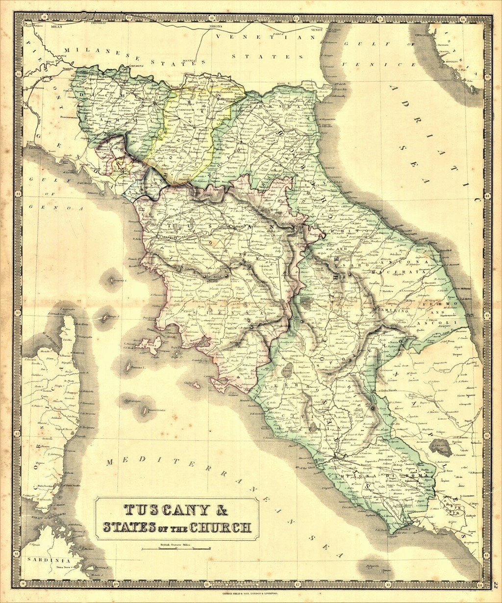 Carta geografica raffigurnate i territori dell'Italia centrale. Piccoli fori di tarlo che non compromettono l'ottimo stato di conservazione generale. Restauro a strappetto marginale perfettamente eseguito Attraente coloritura coeva all'acquerello.