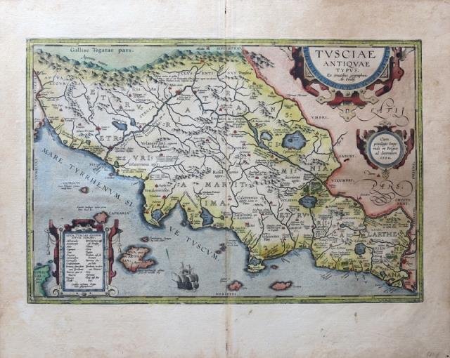 Ex conatibus geographicis Ab. Ortelij. Cum privilegio Imperiali et Belgico ad decennium, Anversa, 1584. Dal “Theatrum Orbis Terrarum”, incisione in rame, colore d'epoca, cm 32,2 x 48 (alla lastra) più margini, testo latino al verso, in alto a ds. titolo entro cartiglio a volute. Il "Theatrum Orbis Terrarum" è stato il primo atlante moderno, comprendente carte di tutte le zone del mondo. Prima di allora la produzione cartografica era stata irregolare, locale a livello di produzione, e i pochi atlanti, i cosiddetti "Atlanti Lafreriani" erano costituiti su richiesta, raccogliendo carte di alcune zone e ignorando le altre. La geniale intuizione di Ortelio fu appunto quella di riunire, in un unico corpus, la produzione cartografica del periodo, costituendo la base per un'impresa editoriale di enorme successo che sarebbe stata pubblicata dal 1570 al 1612. Un piccolo forellino sulla sinistra, al centro del foglio, peraltro bell’esemplare, a pieni margini e ben conservato.