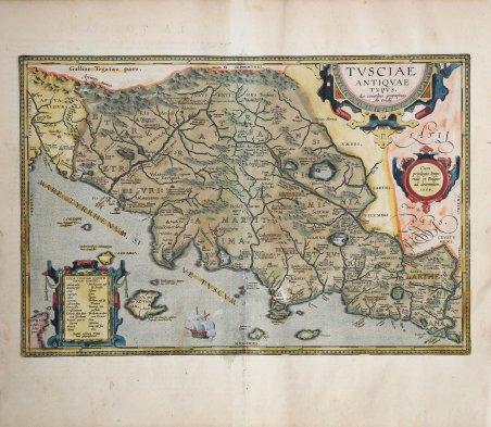 SECONDA VERSIONE DELLA CELEBRE TUSCIAE ANTIQUAE TYPUS DI ORTELIUS Splendida carta storico-geografica della Tuscia, pubblicata nel ' Parergon ' di Abraham Ortelius. Esemplare dalla rara edizione italiana del Theatrum Orbis Terrarum stampata ad Anversa da Jean Baptiste Vrients nel 1608 e quindi nel 1612. Questa carta succede a una lastra precedente con lo stesso titolo e molto simile. Si distingue perché ha "LATII PARS" in caratteri corsivi sopra e sotto il cartiglio di privilegio. La nave naviga verso ovest nella prima lastra, verso est in questa versione più recente. Un secondo stato della lastra: Tra il 1595 e il 1601 furono introdotte le strade romane: La "Via Clodia" che corre lungo il lato nord della mappa e da metà nord scende verso Roma; anche la "Via Flamminia" che corre da Roma verso nord, e altre ancora. Titolo: TVSCIAE | ANTIQVAE | TYPVS. | Ex conatibus geographicis | Ab. Ortelij. Cartiglio al centro a destra: "Cum | priuilegio Impe:|riali et Belgico | ad decennium. | 1584. Nel cartiglio in basso a sinistra si trova un elenco con toponimi. Le fonti cartografiche utilizzate da Ortelio sono la carta della Toscana di Bellarmato del 1536 (Meurer p. 113, Karrow 10/1, p. 78-80), integrata da fonti classiche, quali Livio, Plinio, Catone, Vergilio, Alicarnasso e Plutarco. Circa una decade dopo la pubblicazione del “moderno” Theatrum Orbis Terrarum, Ortelius rispose alle “preghiere di amici e studiosi di storia antica, sacra e profana” e compilò una serie di mappe di soggetto biblico e classico, quasi tutte disegnate da lui. Intitolò l’opera “Parergon theatri”, ovvero “aggiunta, appendice, del Theatrum”, ma al tempo stesso anche complementare al Theatrum: il Paregon theatri forniva per il mondo antico lo stesso materiale che Ortelius aveva fornito per il mondo moderno con il Theatrum: carte geografiche. Lo spirito del Parergon è tutto riassunto nel motto historiae oculus geographia riportato sul frontespizio: la geografia è l’occhio della storia. Le mappe del mondo antico avevano lo scopo di “rendere più chiari gli storici antichi e i poeti”. Le mappe del Paregon sono di tre tipologie: antiche regioni; carte letterarie e carte bibliche. Come sottolinea Koeman “il Parergon deve essere considerato come lavoro personale di Ortelius. Per quest'opera, infatti, diversamente dal Theatrum, non copiò le mappe di altri cartografi, ma ne disegnò lui stesso di nuove ed originali. Riprese luoghi, regioni e territori delle civiltà classiche illustrandone e spiegandone la storia, una materia molto vicina al suo cuore. Le mappe e le lastre del Parergon devono essere valutate come le più importanti incisioni che rappresentano il diffuso interesse per la geografia classica nel XVI secolo”. “Si termina questa region da due fiumane, dal Tevere in Levante, & dalla Magra per Ponente; dal monte Apennino è vallata verso Tramontana, & dal suo mare, overo Toscano vien bagnata alla volta d'Ostro” (p. xxij). Stando alla divisione di Augusto questa è la settima regione in cui pressappoco a metà degli Appennini, in quello che era territorio di Arezzo, nasce il fiume Tevere che un tempo era chiamato Tibris ed ancor prima Albula. “È esiguo dapprima, e non navigabile, se le sue acque non sono raccolte in serbatoi e poi fatte uscire.diventa navigabile solo dopo nove giorni di trattenuta delle sue acque se non si ha l'aiuto della piogge. Dopo il Chianti aretino è ingrossato da 42 affluenti, i principali dei quali sono il Nera e l'Aniene ed è aumentato anche dal non minor numero di acque e di sorgenti che gli acquedotti portano a Roma; perciò, navigabile ormai da imbarcazioni di qualsiasi grandezza provenienti dal mare Italico, e perciò mercante tranquillissimo dei prodotti di tutto il mondo.”. (III. 53-54). La carta realizzata da Ortelius si basa su quella della Toscana di Bellarmato ed è completata da notizie storiche tratte da Livio, Plinio, Virgilio, Alicarnasso etc. Nell'an. Splendid historical map of Tuscany, published in Abraham Ortelius' Parergon. Example from the rare Italian edition of Theatrum Orbis Terrarum printed in Antwerp by Jean Baptiste Vrients in 1608 and then in 1612. This map succeeds an earlier plate with the same title and very similar. It is distinguished because has "LATII PARS" in cursive lettering above and below privilege cartouche. The ship sails westwards in the early plate, eastwards in this late plate. A second state of the plate; between 1595 and 1601 Roman roads were introduced: "Clodia Via" which runs along the North side of the map and from mid North veers downwards to Rome; also "Via Flamminia" which runs from Rome Northwards, and more. Title: TVSCIAE | ANTIQVAE | TYPVS. | "Ex conatibus geographicis | Ab. Ortelij". [Map of Ancient Tuscany, from the geographical efforts of Abraham Ortelius]. Cartouche middle right: "Cum | priuilegio Impe:|riali et Belgico | ad decennium. | 1584". [With an imperial and Belgian privilege for ten years. 1584]. Cartouche bottom left: List with names of uncertain location in two columns). Lower left: "Squalet lucifugis insula plena | viris Rutil. lib.1". [This island lies waste, full of people as it is, who are afraid of the light]. Lower left: "Insula inexhaustis calibum | generosa metallis, Virg". [According to Vergilius, this island yields an inexhaustible supply of steel]. Upper left: "Auser fluuius hodie se | minime in Arnum exo:|nerat sed a Luca | mare recta | petit". [The river Auser, which now hardly empties itself in the river Arno, but goes directly to the sea.] The cartographic sources used by Ortelius are from Bellarmati's map of Tuscany (Meurer p. 113, Karrow 10/1, p. 78-80), supplemented by classical sources, viz. Livius, Plinius, Cato, Vergilius, Halicarnassæus and Plutarchus. The Parergon is the first historical atlas ever published. It was initially conceived by Ortelius as an appendix to his Theatrum Orbis Terrarum but given the considerable success of these historical maps it later 
