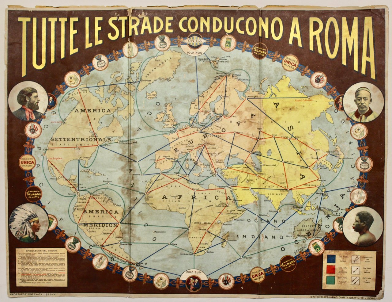 Cromolitografia su cartone a tre ante con testo pubblicitario al verso, mm 520x690. Decorativo e non comune gioco di giro del mondo raffigurante il planisfero in epoca fascista con agli angoli 4 medaglioni raffiguranti abitanti di diverse parti del mondo, circondato da medaglie pubblicitarie raffiguranti prodotti Talmone, azienda fondata nel 1850 a Torino. Questa pubblicità fu ideata un anno prima che l'azienda fosse trasferita in Francia nel 1929. Esemplare in discrete condizioni con qualche alone, difetti e usure ai margini.<BR><BR>Chromolithography on card with printed text on verso, mm 520x690 <BR>Decorative game of goose showing a worldmap of fascist period; it's surrounded by four portraits, with inhabitants of different parts of the world and many round publicities of Talmone's products.<BR>Talmone was founded in 1850 in Turin by Michele Talmone and in 1929 was transferred to France.<BR>Fairly good condition, some what rubbed at edges, scattered light staines <BR><BR>