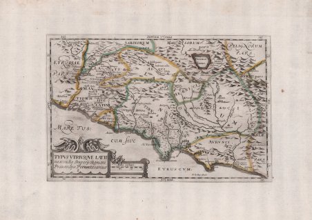 Rara edizione francese, incisa da Henri le Roy. Carta storico geografica tratta da ' Italia Antiqua ' di Philipp Cluver (1580-1623) - noto anche con il nome latinizzato in Cluverius e quello di Cluverio in italiano - geografo tedesco e fondatore della geografia storica. Tra il 1607 e il 1610 viaggiò attraverso varie regioni europee, toccando l’Inghilterra, la Germania, la Francia e l’Italia, dove fece un ulteriore viaggio tra il 1616 ed il 1618. La celebre opera conobbe una prima edizione nel 1624 a Leida, con le mappe incise da Nicolas van Geelkercken (1585-1656). Dell’opera del Cluver sono note numerose ristampe sia a Leida che in altre città europee; tutte comprendono mappe basate sulle originali del Geelkercken, ma incise da altri artisti. Le carte furono ristampate, in forma ridotta, in primis da Hendrick Hondius. ' ' La più rara ristampa viene pubblicata a Parigi nel 1659 con le lastre rifatte dall'incisore francese Henri le Roy come si legge nell'angolo di sinistra della nostra mappa. Henri Le Roy (1579-1652) fu un incisore ed editore nato a Rotterdam e sposato a Parigi nel 1604. Ha prodotto una serie di disegni ispirati al mondo naturale, incorporando uccelli, insetti e piante nel suo lavoro. È il caso di questa serie di sette disegni di fregio, che potrebbero essere stati utilizzati come disegni per ornamenti architettonici, tessuti o altri oggetti. Nel settore cartografico sono note alcune mappe, tra le quali una carta del mondo, di derivazione da Hendrick Hondius. Acquaforte, con coloritura coeva dei contorni, in ottimo stato di conservazione. The rare French edition, engraved by Henri le Roy. Historical-geographical map taken from the ' Italia Antiqua ' by Philipp Cluver (1580-1623) - also known by the Latin name Cluverius and the Italian name Cluverio - German geographer and founder of historical geography. Between 1607 and 1610 he traveled through various European regions, touching England, Germany, France and Italy, where he made a further journey between 1616 and 1618. The famous work had a first edition in 1624 in Leiden, with maps engraved by Nicolas van Geelkercken (1585-1656). Numerous reprints of Cluver's work are known both in Leiden and in other European cities; all of them include maps based on Geelkercken's originals, but engraved by other artists. The maps were reprinted, in reduced form, primarily by Hendrick Hondius. ' ' The rarest reprint was published in Paris in 1659 with the plates redone by the French engraver Henri le Roy as shown in the left corner of our map. Henri Le Roy (1579-1652) was an ' engraver and publisher born in Rotterdam and married in Paris 1604. He produced a number of designs inspired by the natural world, incorporating birds, insects and plants into his work. Such is the case in this series of seven frieze designs, which could have been put to use as designs for architectural ornaments, textiles or other objects. In the field of cartography are known some maps, including a map of the world, derived from Hendrick Hondius. Etching, with coeval coloring of the outlines, in excellent condition. Cfr.