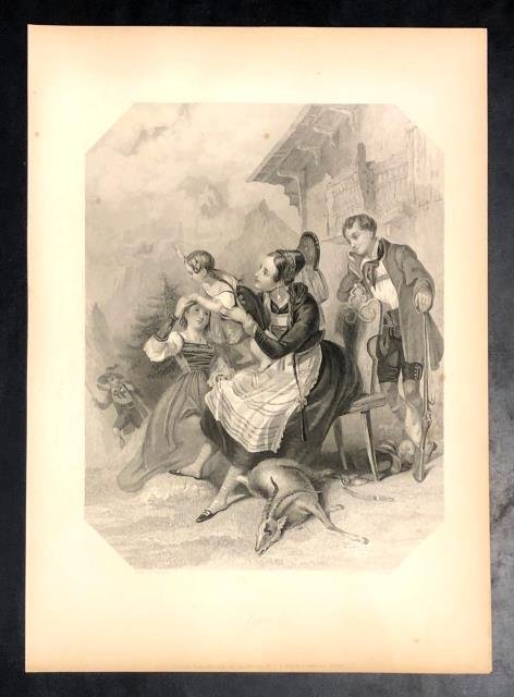 Da un dipinto di J. Browne e con l'inciso di C. E. Wagstaff, incisione su acciaio in b/n, 1830 circa, cm 25 x 35 (il foglio). Veduta ravvicinata e animata di una giovane famiglia tirolese fuori dalla propria casa. La scena è felice e narrativa: due donne intrattengono una allegra bambina, ai piedi della donna seduta su una panchetta giace un cervo, sobriamente ma palesemente esposto come bottino di caccia, il giovane uomo ancora impugna il fucile; un altro uomo della famiglia, riconosciuto in un animoso saluto dalla bambina tenuta in braccio, sta avvicinandosi di corsa alla casa. Ottimo stato di conservazione.