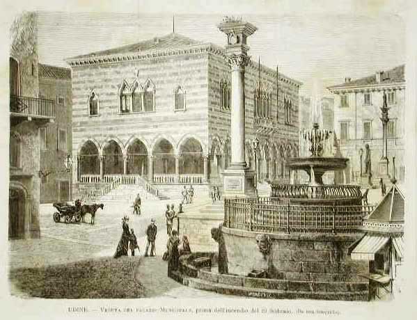 Veduta del palazzo Municipale di Udine, com'era prima dell'incendio, e della pittoresca piazza Contarena. Testo al verso