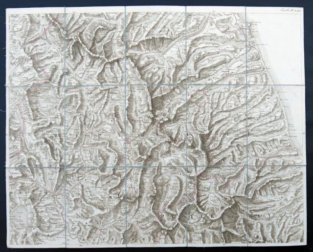 Dalla “Carta Amministrativa del Regno d’Italia co' suoi stabilimenti politici, militari, civili e religiosi e con una parte degli stati limitrofi. Costrutta nel Deposito della Guerra per ordine del Ministro della Guerra e Marina nell'anno MDCCCXI, aggiunta e corretta nell'anno 1813”, edita a Milano nel 1813 (una grande carta composta da più fogli quadrettati e applicati su tela d'epoca, ciascuno di cm 54 x 67 circa per un perimetro totale di cm 1400 x 1100 circa), bella carta comprendente i territori dell'Umbria e degli Abruzzi, delimitata a ovest dai confini con la Toscana e il Lazio (Arezzo, Cortona, Chiusi e il Lago di Bolsena) e a est dalla costa delle Marche e degli Abruzzi. La carta è composta da un foglio, numerato come foglio XXIV sulla parte incisa, e con il numero 24 al retro della tela. Benedetto e Gaudenzio Bordiga furono incisori e cartografi, originari della Valsesia e attivi a Milano nella prima metà del XIX secolo, un periodo caratterizzato da alterne vicende storico politiche, in cui realizzarono un discreto corpus incisorio. L'opera più importante cui contribuirono fu la “Carte générale du Théâtre de la Guerre en Italie”, una grande carta commissionata, nel 1797 dallo Stato Maggiore dell'Armata Francese di Napoleone, al capo battaglione Bacler d'Albe, capo del Gabinetto Cartografico Francese: la carta, celebrativa della prima campagna d'Italia, fu in gran parte realizzata a partire da carte preesistenti, fu realizzata in cinquantaquattro fogli sotto la direzione di Giacomo Pinchetti e fu appunto incisa dai fratelli Benedetto (1800 - 1834) e Gaudenzio Bordiga. Gaudenzio Bordiga (Camasco, Varallo, 10 febbraio 1773 – Milano, 18 gennaio 1837), seguì a Varallo studi letterari e di disegno. Stabilitosi a Milano con il fratello Benedetto, fu capo incisore dell'Istituto Geografico Militare e mantenne tale carica anche dopo l'occupazione austriaca. Senza la collaborazione del fratello Benedetto, Gaudenzio disegnò, e a volte incise, varie carte geografiche militari (“Carta delle stazioni militari in Italia”, 1804; “Carta militare del Regno d'Etruria e del principato di Lucca”, 1806) e scrisse opere di erudizione storico – artistica (“Notizie intorno alle opere di Gaudenzio Ferrari, pittore e plasticatore”, Milano, G. Pirotta, 1821; “Storia e guida del Sacro Monte di Varallo“, Varallo, 1830). Molto buono lo stato di conservazione.