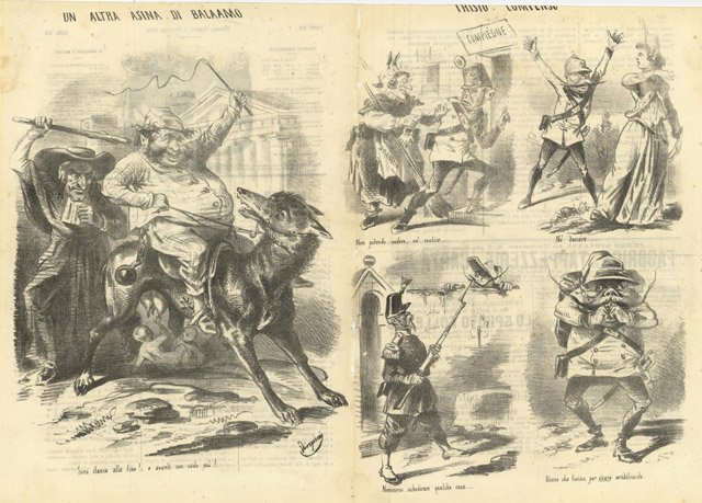 La stampa è stata piegata per la spedizione e porta al retro, con inchiostro rosso, un timbro rotondo di 1 centesimo,testo al verso. Piccoli restauri alla piega centrale.