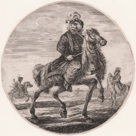 Cavaliere ungherese a cavallo verso destra, di fronte, con un altro cavaliere dietro a sinistra al galoppo e un terzo cavaliere dietro a destra, e il mare in lontananza a sinistra; composizione circolare. Acquaforte, 1651 circa, scritta sotto l'immagine con dettaglio di produzione: "S.D.Bella F.". Da una serie di undici stampe tonde non numerate. Magnifica prova, ricca di toni, impressa su carta vergata databile alla prima metà del diciottesimo secolo, rifilata alla linea marginale, in buono stato di conservazione. Stefano della Bella fu uno degli incisori più interessanti e originali nella Firenze del XVII secolo e può considerarsi l’unico geniale continuatore dell’opera di Jacques Callot. La sua educazione artistica ebbe inizio a Firenze nella bottega degli orafi Gasparo Mola e Orazio Vanni, e la precisione del segno, tipica dell’arte orafa resterà caratteristica del suo stile. Studiò poi presso Giovanni Battista Vanni e forse anche presso il Cantagallina e Cesare Dandini, ma ben presto si dedicò all'incisione. Il suo vero maestro può considerarsi Jacques Callot, l’incisore francese che soggiornò a lungo a Firenze lasciando una forte impronta nel panorama artistico della città. Gli anni più importanti della sua carriera sono quelli che trascorre a Parigi, dal 1639 al 1650, stipendiato da Lorenzo de' Medici: lavorò insieme ad Israel Silvestre, con gli editori Langlois, Ciartres e Pierre Mariette, per stampatori francesi e per commissioni di gran prestigio, come quelle del 1641 per il cardinale Richelieu che gli affidò le illustrazioni delle sue imprese guerresche. Intorno al 1647, durante un viaggio in Olanda, dove eseguì le acqueforti con le vedute del porto di Amsterdam, incontrò Rembrandt e da quella data notiamo una eco profonda dell’arte dell’olandese nella grafica del Della Bella. Bibliografia De Vesme - Massar Stefano della Bella (1971) n. 277. Hungarian horseman; riding towards right, facing front, with another horseman behind to left galloping and a third horseman behind to right, and the sea in the distance to left; a round composition. Etching, 1651 circa, lettered below image with production detail: "S.D.Bella F.". From a Series of eleven unnumbered round prints. Beautiful proof, with rich tonalities, printed on laid paper datable from the first half of the eighteenth century, trimmed at the borderline, in good conditions. Stefano della Bella was one of the most interesting and original engravers in 17th-century Florence and can be considered the only brilliant continuator of Jacques Callot's work. His artistic education began in Florence in the workshop of the goldsmiths Gasparo Mola and Orazio Vanni, and the precision of sign, typical of the goldsmith's art, will remain characteristic of his style. He then studied under Giovanni Battista Vanni and perhaps also under Cantagallina and Cesare Dandini, but soon turned to engraving. His real master can be considered Jacques Callot, the French engraver who stayed in Florence for a long time and left a strong imprint on the city's artistic scene. The most important years of his career were the ones he spent in Paris, from 1639 to 1650, salaried by Lorenzo de' Medici: he worked together with Israel Silvestre, with the publishers Langlois, Ciartres and Pierre Mariette, for French printers and for commissions of great prestige, such as those of 1641 for Cardinal Richelieu, who entrusted him with illustrations of his warlike exploits. Around 1647, during a trip to Holland, where he executed etchings with views of the port of Amsterdam, he met Rembrandt, and from that date we note a profound echo of the Dutchman's art in Della Bella's graphic work. Bibliografia De Vesme - Massar ' Stefano della Bella ' (1971) n. 277. Cfr.