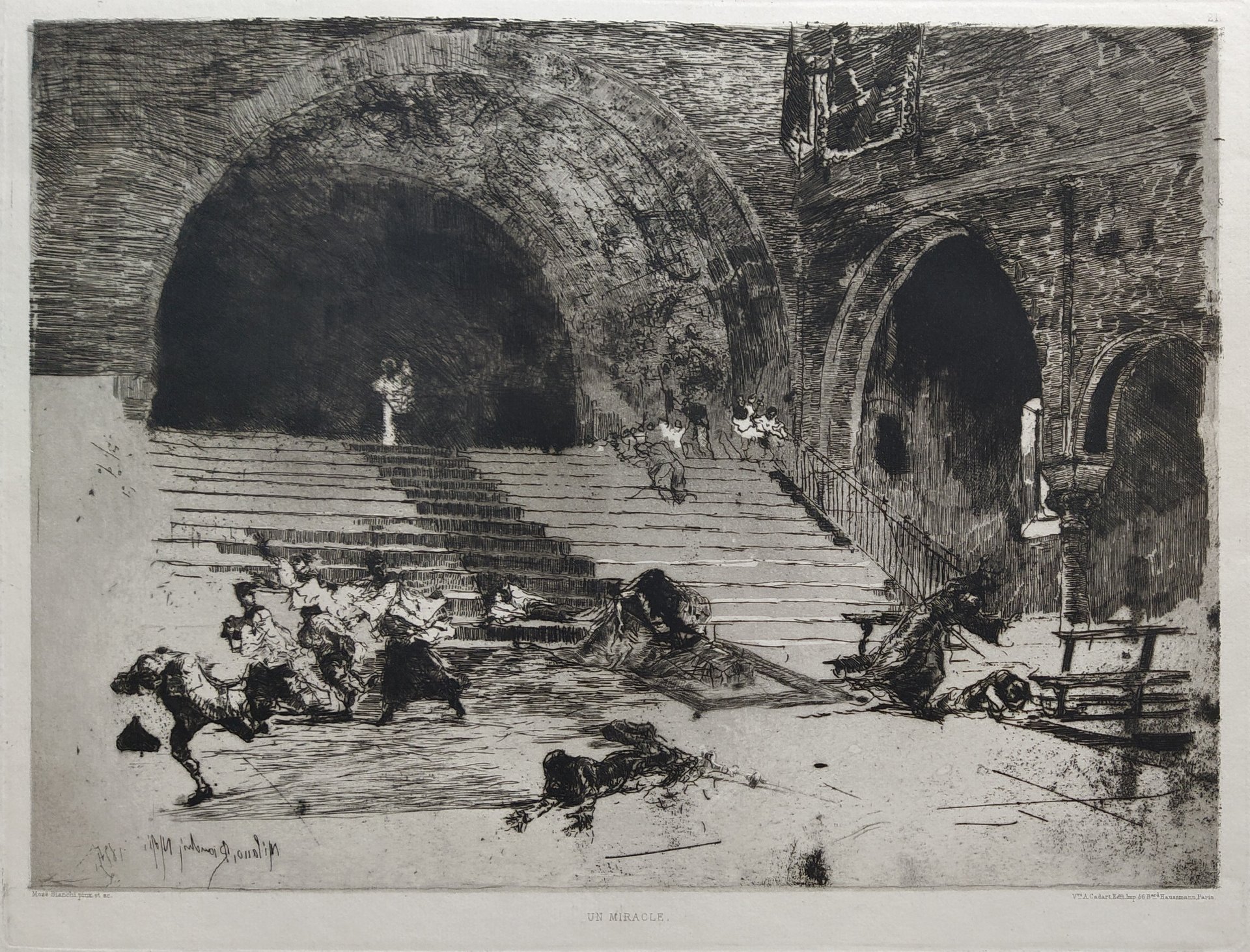 Impressione eccellente, dal tratto deciso e neri intensi. Giochi chiaroscurali sottolineano l'effetto impressionistico che scaturisce soprattutto dal movimento dei personaggi in fuga e dal bagliore della luce. Ottimo stato di conservazione. Ampi margini. Tavola numero “21” in alto a destra, titolo “Un miracolo” in basso al centro e 'indirizzo dell'editore in basso a destra ".56 Bard Haussmann.” tutti incisi in lastra fuori dal soggetto. Firmata, datata e siglata: "Milano Bianchi Mosé 1874” in lastra a rovescio. Edizione parigina apparsa negli album Cadart.