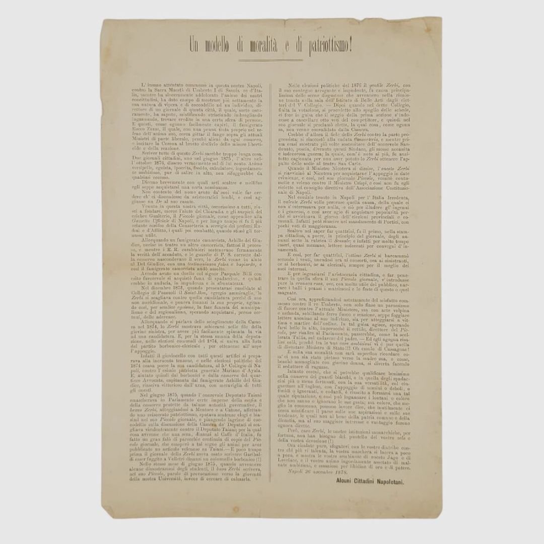 Foglio in 4° cm 31×21, Napoli 26 novembre 1878, a firma di Alcuni Cittadini Napoletani, che tratta dell’attentato commesso in questa nostra Napoli contro la Sacra Maestà di Umberto I di Savoia… Naturali tracce d’uso, ma in buone condizioni. Il tema della polemica, rivolta contro il famigerato Rocco Zerbi che si potrebbe qualificare benissimo nella camorra dei guanti bianchi, approfondisce uno scenario di camorra e corruzione nel quale si contrappongono le posizioni dei RR. Carabinieri e delle guardie di P.S. Ancora, si citano intrecci tra politica, camorra e mafia. Il tutto, all’interno delle candidature per il collegio di Pozzuoli.