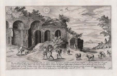 Veduta tratta dalla serie ' Vestigi delle Antichità di Roma Tivoli Pozzuolo et altri luoghi, che Sadeler incide, riprendendole dalla serie del francese Stefano Du Pérac, con la tecnica del bulino e in formato ridotto. L'opera consta di 50 tavole, pubblicate da Marco Sadeler nel 1606 a Praga, attivissimo centro culturale, con lo stesso titolo ' Vestigi delle Antichità di Roma ' e le medesime descrizioni di Du Pérac in lingua italiana, manca la citazione dell'inventore. Incisore di corte presso Rodolfo II, Sadeler aveva compiuto viaggi in Germania e in Italia, soggiornando a Roma nel 1593. Nella sua opera compaiono però anche vedute di “. Tivoli, Pozzuolo et altri luochi”, che mancano in quella di Du Pérac (sono tredici le tavole nuove), nelle quali viene accentuato l'aspetto naturalistico). Bulino, impresso su carta vergata coeva, con margini, perfetto stato di conservazione. View taken from ' Vestigi delle Antichità di Roma Tivoli Pozzuolo et altri luoghi, ' after Etienne Du Pérac. Lettered in lower margin, with publisher's address and with Italian key to letters from within composition: “Marco Sadeler excudit.”. Engraving, 1606, second state with publisher’s address. The work consists of 50 plates first published by Marco Sadeler in 1606 in Prague with the same title and the same descriptions of Du Pérac in Italian. After taht the plates are re issued in Rome by Domenico De’ Rossi. Engraver at the court of Rudolf II, Sadeler had made trips to Germany and Italy, staying in Rome in 1593. In his work appear also views of Tivoli and Pozzuoli missing in that of Du Pérac (are thirteen new plates) in which is emphasized naturalistic. A fine impression, printed on contemporary laid paper, with margins, good condition. Cfr.