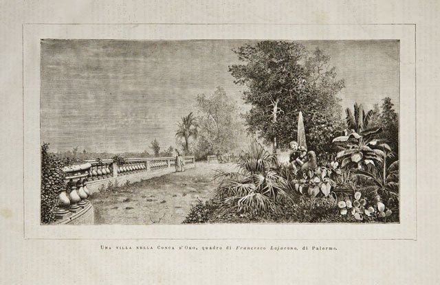 Graziosa veduta del giardino di una villa nella Conca d'Oro di Palermo. L'incisione traduce a stampa un quadro del pittore Francesco Lojacono. Testo al verso