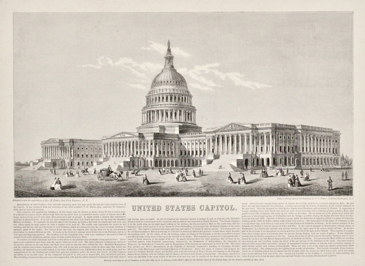 Incisione in legno di mm 210x380 (l'immagine) su foglio di mm 345x440. Bella visione in primo piano del Campidoglio di Washington con il testo di descrizione al piede dell'incisione. Ottimo esemplare. <BR>