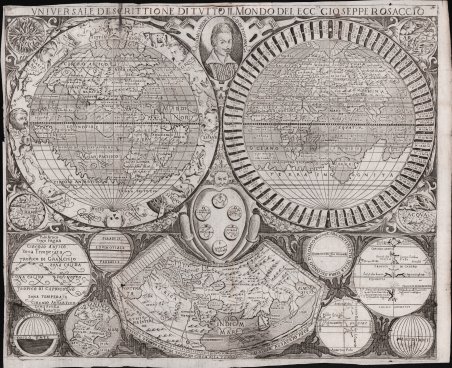 Rara carta del mondo pubblicata separatamente da Luigi Rosaccio. La carta deriva dal planisfero murale di suo padre, Giuseppe Rosaccio (1597, Bifolco-Ronca n. 31). Rodney Shirley nota che “This curiously elaborate world map is to be found in a speculative world geography by Giuseppe Rosaccio. The right-hand hemisphere is surrounded by bands denoting the climates; the left-hand one by lively windheads and celestial constellations. In the centre cusp is a dyspeptic portrait of the young Duke Cosimo II de Medici, and in the spandels are circular representations of the four elements. The lower part of the engraving consists of a neatly engraved Ptolemaic map of the world and a set of spherical diagrams showing the zones, meridians, and geographical features”. La mappa è molto rara; questo è un esempio del secondo stato, con una barba aggiunta al ritratto di Cosimo de Medici. Priva di datazione, la carta risulta stampata a Firenze, dove la famiglia Rosaccio si era trasferita dopo il periodo veneziano, il 28 novembre 1606, ottenendo il privilegio della stampa per le proprie opere - vedi Casali, Il 'Teatro "del mondo. GR (ca 1530-1620) tra Firenze e Bologna, in L'Europa divisa e i nuovi mondi. Per Adriano Prosperi, II, a cura di M. Donattini - G. Marcocci - S. Pastore, Pisa 2011, p. 56. Aloisio, Aluigio, Alovigi o probabilmente Luigi Rosaccio, figlio del cosmografo Giuseppe Rosaccio, si formò a Firenze, forse con Antonio Tempesta, alla corte dei Medici. Fin dai primi anni Novanta, Giuseppe Rosaccio si stabilì a Firenze, dove il 13 luglio 1594 entrò nella compagnia dell'"Arte dei medici e speziali" (Casali, 2011, p. 56 e n. 15 p. 62) come venditore di libri, ponendosi al servizio e sotto la protezione del Granduca dal suo 'banco' aperto sulla prestigiosa Piazza del Palazzo e dedicando alcune delle sue opere più significative a Ferdinando, Cosimo II e alla granduchessa Cristina. Sempre nella città dei Medici, il 28 novembre 1606 ottenne il privilegio di stampare per le proprie opere (Casali, 2011, pp. 56 s.). Luigi Rosaccio si cimentò nell'arte incisoria, traducendo in stampa le numerose opere del padre. Nel 1610 realizzò il ciclo di illustrazioni incluse nella descrizione delle "Esequie d'Arrigo Quarto cristianissimo re di francia e di Navarra celebrate in Firenze dal Serenissimo DON COSIMO II Gran Duca di Toscana". Descritto da Giuliano Giraldi pubblicato a Firenze da Bartolomeo Sermartelli, importante come testimonianza visiva del complesso delle decorazioni più che per le qualità stilistiche e tecniche, non particolarmente brillanti. Sempre al periodo fiorentino sono legate le tre splendide carte geografiche raffiguranti l'Italia, una grande carta che precede l'Italia Nova di Giovanni Antonio Magini, la Toscana (la cosiddetta "Carta del Cavallo"), e il Piemonte. Bibliografia Shirley, The Mapping of The World, #268. Rare separately published map of the World by Luigi Rosaccio, after the of the largest World Map of his father Giuseppe Rosaccio (1597, Bifolco-Ronca n. 31). Rodney Shirley notes: “This curiously elaborate world map is to be found in a speculative world geography by Giuseppe Rosaccio. The right-hand hemisphere is surrounded by bands denoting the climates; the left-hand one by lively windheads and celestial constellations. In the centre cusp is a dyspeptic portrait of the young Duke Cosimo II de Medici, and in the spandels are circular representations of the four elements. The lower part of the engraving consists of a neatly engraved Ptolemaic map of the world and a set of spherical diagrams showing the zones, meridians, and geographical features” The map was engraved by Giuseppe’s relative Alovisio Rosaccio and is very scarce. This is an example of the second state, with a beard added to the portrait of de Medici. Without the data, the map is printed in Florence, where the Rosaccio family was transferred after the Venetian period, on 28 November 1606, obtaining the privilege of printing for their works - see Casali, Il 'Teatro "del mondo. GR (ca 1530-1620) tra Firenze e Bologna, in L’Europa divisa e i nuovi mondi. Per Adriano Prosperi, II, a cura di M. Donattini - G. Marcocci - S. Pastore, Pisa 2011, p. 56. Aloisio, Aluigio, Alovigi or probably Luigi Rosaccio, son of the cosmographer Giuseppe Rosaccio, was trained in Florence, perhaps with Antonio Tempesta, at the Medici court. Since the early nineties, Giuseppe Rosaccio settled in Florence, where on 13 July 1594 ' joined the company ' of “Arte dei medici e speziali (Art of doctors and apothecaries)” (Casali, 2011, p. 56 and n. 15 p. 62) as a seller of books, placing himself at the service and under the protection of the Grand Duke from his 'bench' opened on the prestigious Piazza del Palazzo and dedicating some of his most significant works to Ferdinando, Cosimo II and the Grand Duchess Cristina. Still in the city of the Medici, on 28 November 1606 he obtained the privilege of printing for his own works (Casali, 2011, pp. 56 s.). Luigi Rosaccio tried his hand at engraving art, translating his father's numerous works into a print. In 1610 he made the cycle of illustrations included in the description of the “Esequie d’Arrigo Quarto cristianissimo re di francia e di Navarra celebrate in Firenze dal Serenissimo DON COSIMO II Gran Duca di Toscana”. Described by Giuliano Giraldi published in Florence by Bartolomeo Sermartelli, important as visual testimony of the complex of the decorations rather than for the stylistic and technical qualities, not particularly brilliant. Always in the Florentine period are related to the three wonderful geographic maps depicting Italy, a great map preceding the Italia Nova of Giovanni Antonio Magini, Tuscany (the so-called “Carta del Cavallo”), and Piedmont. Bibliografia Shirley, The Mapping of The World, #268. Cfr.