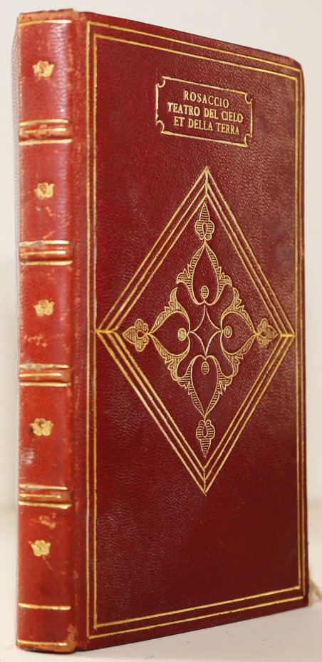 Vniuersale discrittione del teatro del cielo, et della terra. Di Gioseppe Rosaccio, cosmografo, & dottore in filosofia, & medicina. Nel quale si tratta breuemente, dell’ordine delle sfere, & sua grandezza. . Dall’auttore adornato con figure a i suoi luoghi principali, con una copiosa tauola delle cose piu notabili, che nell’opera si contengono. . In Venetia: appresso il Ciotti, MDCXXIX (1629). ' In-8° piccolo, legatura in piena pelle ottocentesca. Pp 141, (1), (2) bianche, (8), doppio frontespizio il secondo con mappamondo, 3 figure nel testo, 11 mappe (di cui 8 a doppia pagina), 4 capolettere animati, il tutto inciso in xilografia. Segnatura: [A-I8, *8]. Affascinante edizione di uno dei testi più fortunati di Giuseppe Rosaccio (Pordenone, 1530-Venezia, 1621 ca.), stimato cartografo attivo a Venezia e autore di svariati atlanti, carte e planisferi, nonché di opere astronomiche, astrologiche e geografiche assai divulgate nella seconda metà del XVI secolo: Il Microcosmo, Mondo elementare e celeste, Discorso sulla nobiltà ed eccellenza delle Terra. A lui si deve anche la cura di un'edizione della Geografia di Tolomeo. Nel 1580 pubblicò per la prima volta il Teatro del cielo e della terra, impostato secondo la concezione aristotelico-tolemaica, nel quale si illustra la struttura sferica del cosmo attraverso questa gerarchia: Cielo empireo, Primo mobile, Ciel cristallino, Saturno, Giove, Marte, Sole, Venere, Mercurio, Luna, Fuoco, Aria, Acqua, Terra, Seno di Abram, Limbo, Purgatorio, Inferno. La presente opera se da un lato si presenta come una classica enciclopedia umanistica uniformante, quindi, in base alla visione del mondo tardo cinquecentesca, temi molto vari spazianti dall' astronomia, alla filosofia della natura, alla geologia fino alla religione, dall'altro tuttavia fornisce notizie precise sia testuali che grafiche su aspetti geografici e topografici basati su studi ma anche su ricerche sul campo (principalmente sull' Italia e l’Europa). Si ricordano ad esempio notizie su vari aspetti dell'Appennino tosco-emiliano (Porretta, San Donino); Sicilia e Sardegna; paesi scandinavi; Isole dei mari del Nord (Orcadi, Ebridi, Shetland); etc. Presenti anche notizie climatiche e sulle comete. Tutti i disegni sono dell'autore Dedicatoria dello stampatore al nobile veneziano Andrea Bragadino. Giuseppe Rosaccio rappresenta la tipica figura dello studioso “enciclopedico” dei secoli XVI e XVII, versato in più discipline. Laureatosi a Padova in filosofia e medicina, diventò medico personale del Granduca Cosimo II de’ Medici, cui dedicò nel 1608 una grande carta corografica della Toscana esercitando, al contempo, la professione di cosmografo e di cartografo. Rosaccio scrisse infatti di medicina, di cosmografia, di storia universale, di geografia, come d’altronde altri autori dell’epoca. Rosaccio non può essere considerato un autore particolarmente originale, soprattutto nei suoi scritti di carattere geografico, ma godette di un notevole successo editoriale fra i suoi contemporanei, tanto che alcune delle sue opere ebbero numerose edizioni, furono ristampate molte volte, alcune anche con degli aggiornamenti, e sicuramente gli procurarono una notevole fama. Bibiografia Cfr. Liruti, Letterati del Friuli, IV, pp. 166-169. In-8° small (14.5x10 cm), Binding in red morocco, spine with four nerves and gilt floral decoration at sections, double gold threading on the plates and a floral lozenge motif in the center. Title in gold on the front plate; threaded squares and gilt edges. pp.141, (1), (2) white, (8), double title page, the second with a globe, 3 figures in the text, 11 maps (including 8 double-page), 4 animated letterheads, woodcut. Marking: [A-I8, *8]. Fascinating edition of one of the most successful texts by Giuseppe Rosaccio (Pordenone, 1530-Venice, 1621 ca.).He was a Venetian physician and cosmographer. He was an authority on the Geography of Claudius Ptolemy, of which he published the Italian version of Ruscelli, with additions by himself in 1598-1599 Also important was his Discorso. della Nobilita e Eccellenza della Terra rispetto à Cieli (Florence c 1610-1615), a speculative world geography which summarized recent published accounts of Pacific voyages. In 1580 he published for the first time Il Teatro del Cielo e della Terra, set according to the Aristotelian-Thelemic conception, in which he illustrates the spherical structure of the cosmos through this hierarchy: Empyrean Sky, First mobile, Crystalline Sky, Saturn, Jupiter, Mars, Sun, Venus, Mercury, Moon, Fire, Air, Water, Earth, Abram's Breast, Limbo, Purgatory, Hell. This work if on the one hand is presented as a classic humanistic encyclopedia unifying, then, according to the worldview of the late sixteenth century, very various topics ranging from astronomy, philosophy of nature, geology to religion, on the other hand, however, provides precise information both textual and graphic aspects of geography and topography based on studies but also on field research (mainly on 'Italy and Europe): as an example news on various aspects of the Appennino tosco-emiliano (Porretta, San Donino); Sicily and Sardinia; Scandinavian countries; Islands of the seas of the North (Orcadi, Hebrides, Shetland); etc. There are also climatic news and on the comets. All drawings are by the author of Dedication of the printer to the Venetian nobleman Andrea Bragadino ' Reference: ' Liruti, ' Letterati del Friuli, ' IV, pp. 166-169. Cfr.