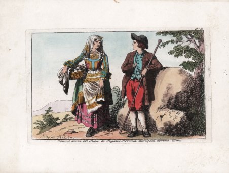 Scena di costume popolare nel tipico stile di Bartolomeo Pinelli, tratta dalla rara ' Raccolta di cinquanta costumi li più interessanti delle città, terre, e paesi, in provincie diverse del Regno di Napoli disegnati, ed incisi all’acquaforte da Bartolomeo Pinelli Romano Dedicati ' stampato ' In Roma, MDCCCXII. Presso Giovanni Scudellari in Via Condotti n. 19 e 20. Bella e rara edizione nella quale sono raffigurati costumi, mestieri e scene di vita popolare del Regno di Napoli. Pinelli, fu stampatore, pittore, scultore e disegnatore; apprese i rudimenti della scultura dal padre, artigiano di piccole statuette religiose di scarso valore. Questo apprendistato in tenera età incoraggiò Pinelli ad enfatizzare la plasticità e l’espressione rispetto ai valori del Neo-Classicismo, predominanti a Roma. Purtroppo, sono pervenute fino a noi solo pochi esemplari delle sue sculture in terracotta, mentre conosciamo il volume di acqueforti, ' Gruppi pittoreschi ' (Roma, 1834), con rappresentazioni di popolani. L’enfasi sul naturalismo e su soggetti di vita quotidiana è di nuovo evidente. Sebbene avesse studiato presso l’Accademia di Belle Arti a Bologna, sostenuto economicamente dal Conte Lambertini, il nipote di Papa Benedetto XIV, Pinelli non aveva interesse a seguire l'iter tradizionale del successo artistico attraverso i soggetti religiosi. Di ritorno a Roma, alla fine del XVIII secolo, decise di vendere le sue opere nei caffè frequentati dai turisti. ' Incisione in rame, finemente colorata a mano, in ottimo stato di conservazione. Popular costume scene in the typical style of Bartolomeo Pinelli, taken from the rare ' Raccolta di cinquanta costumi li più interessanti delle città, terre, e paesi, in provincie diverse del Regno di Napoli disegnati, ed incisi all’acquaforte da Bartolomeo Pinelli Romano Dedicati ' printed ' In Roma, MDCCCXII. Presso Giovanni Scudellari in Via Condotti n. 19 e 20. Rare and beautiful series depicting individual and group popular costumes of the Kingdom of Naples (southern Italy). Pinelli was an Italian printmaker, painter, sculptor and draughtsman. He learnt the rudiments of sculpture from his father, a maker of cheap religious statuettes. This early training encouraged Pinelli to emphasize plasticity and expression over the Neo-classical values prevalent in Rome. Although only a few of his terracotta figures survive however, he did produce a volume of etchings, ' Gruppi pittoreschi ' (Rome, 1834), depicting rustic groups. Its emphasis on naturalism and everyday subject-matter is also characteristic of his sculptures. Although he studied both at the Accademia di San Luca in Rome and at the Accademia di Belle Arti in Bologna, helped financially by Conte Lambertini, Pope Benedict XIV’s nephew, Pinelli was not interested in pursuing the traditional path to artistic success via religious or history painting. On returning to Rome in the late 1790s he chose to peddle his works at the cafés frequented by tourists. Copperplate, finely hand coloured, in excellent condition. Cfr.