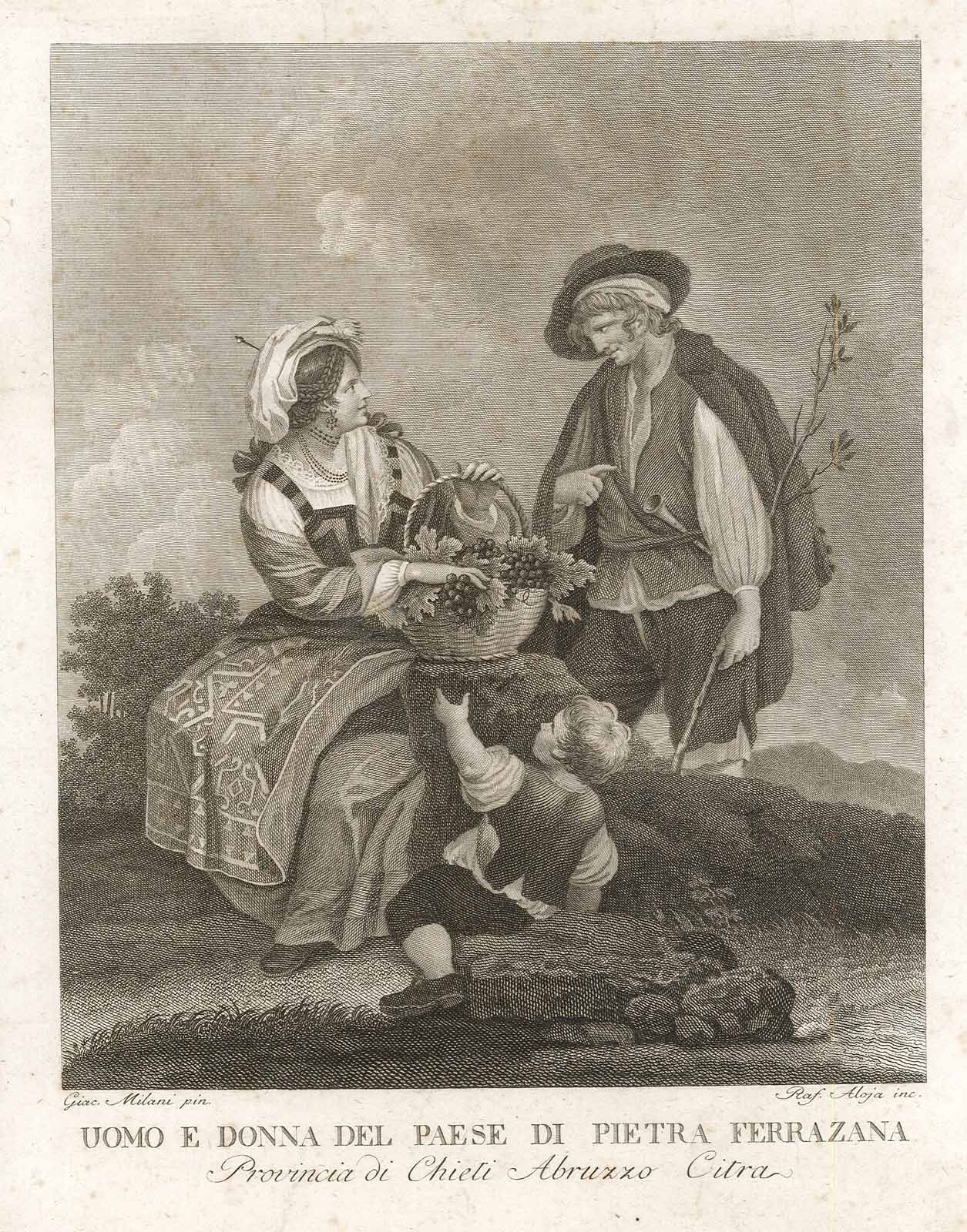 Uomo e donna del paese di Pietra Ferrazana, nella provincia di Chieti, raffigurati nei costumi tradizionali. La scena è importante non solo per l'attenta raffigurazione dei costumi, ma perchè allo stesso tempo lascia intendere che le attività principali del luogo erano la produzione di vino ed olio. Ottimo lo stato di conservazione generale