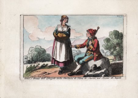 Scena di costume popolare nel tipico stile di Bartolomeo Pinelli, tratta dalla rara ' Raccolta di cinquanta costumi li più interessanti delle città, terre, e paesi, in provincie diverse del Regno di Napoli disegnati, ed incisi all’acquaforte da Bartolomeo Pinelli Romano Dedicati ' stampato ' In Roma, MDCCCXII. Presso Giovanni Scudellari in Via Condotti n. 19 e 20. Bella e rara edizione nella quale sono raffigurati costumi, mestieri e scene di vita popolare del Regno di Napoli. Pinelli, fu stampatore, pittore, scultore e disegnatore; apprese i rudimenti della scultura dal padre, artigiano di piccole statuette religiose di scarso valore. Questo apprendistato in tenera età incoraggiò Pinelli ad enfatizzare la plasticità e l’espressione rispetto ai valori del Neo-Classicismo, predominanti a Roma. Purtroppo, sono pervenute fino a noi solo pochi esemplari delle sue sculture in terracotta, mentre conosciamo il volume di acqueforti, ' Gruppi pittoreschi ' (Roma, 1834), con rappresentazioni di popolani. L’enfasi sul naturalismo e su soggetti di vita quotidiana è di nuovo evidente. Sebbene avesse studiato presso l’Accademia di Belle Arti a Bologna, sostenuto economicamente dal Conte Lambertini, il nipote di Papa Benedetto XIV, Pinelli non aveva interesse a seguire l'iter tradizionale del successo artistico attraverso i soggetti religiosi. Di ritorno a Roma, alla fine del XVIII secolo, decise di vendere le sue opere nei caffè frequentati dai turisti. ' Incisione in rame, finemente colorata a mano, in ottimo stato di conservazione. Popular costume scene in the typical style of Bartolomeo Pinelli, taken from the rare ' Raccolta di cinquanta costumi li più interessanti delle città, terre, e paesi, in provincie diverse del Regno di Napoli disegnati, ed incisi all’acquaforte da Bartolomeo Pinelli Romano Dedicati ' printed ' In Roma, MDCCCXII. Presso Giovanni Scudellari in Via Condotti n. 19 e 20. Rare and beautiful series depicting individual and group popular costumes of the Kingdom of Naples (southern Italy). Pinelli was an Italian printmaker, painter, sculptor and draughtsman. He learnt the rudiments of sculpture from his father, a maker of cheap religious statuettes. This early training encouraged Pinelli to emphasize plasticity and expression over the Neo-classical values prevalent in Rome. Although only a few of his terracotta figures survive however, he did produce a volume of etchings, ' Gruppi pittoreschi ' (Rome, 1834), depicting rustic groups. Its emphasis on naturalism and everyday subject-matter is also characteristic of his sculptures. Although he studied both at the Accademia di San Luca in Rome and at the Accademia di Belle Arti in Bologna, helped financially by Conte Lambertini, Pope Benedict XIV’s nephew, Pinelli was not interested in pursuing the traditional path to artistic success via religious or history painting. On returning to Rome in the late 1790s he chose to peddle his works at the cafés frequented by tourists. Copperplate, finely hand coloured, in excellent condition. Cfr.