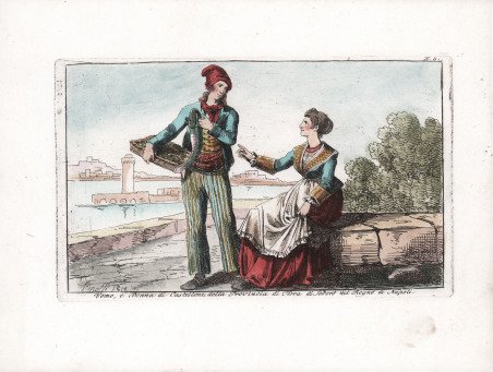 Scena di costume popolare nel tipico stile di Bartolomeo Pinelli, tratta dalla rara ' Raccolta di cinquanta costumi li più interessanti delle città, terre, e paesi, in provincie diverse del Regno di Napoli disegnati, ed incisi all’acquaforte da Bartolomeo Pinelli Romano Dedicati ' stampato ' In Roma, MDCCCXII. Presso Giovanni Scudellari in Via Condotti n. 19 e 20. Bella e rara edizione nella quale sono raffigurati costumi, mestieri e scene di vita popolare del Regno di Napoli. Pinelli, fu stampatore, pittore, scultore e disegnatore; apprese i rudimenti della scultura dal padre, artigiano di piccole statuette religiose di scarso valore. Questo apprendistato in tenera età incoraggiò Pinelli ad enfatizzare la plasticità e l’espressione rispetto ai valori del Neo-Classicismo, predominanti a Roma. Purtroppo, sono pervenute fino a noi solo pochi esemplari delle sue sculture in terracotta, mentre conosciamo il volume di acqueforti, ' Gruppi pittoreschi ' (Roma, 1834), con rappresentazioni di popolani. L’enfasi sul naturalismo e su soggetti di vita quotidiana è di nuovo evidente. Sebbene avesse studiato presso l’Accademia di Belle Arti a Bologna, sostenuto economicamente dal Conte Lambertini, il nipote di Papa Benedetto XIV, Pinelli non aveva interesse a seguire l'iter tradizionale del successo artistico attraverso i soggetti religiosi. Di ritorno a Roma, alla fine del XVIII secolo, decise di vendere le sue opere nei caffè frequentati dai turisti. ' Incisione in rame, finemente colorata a mano, in ottimo stato di conservazione. Popular costume scene in the typical style of Bartolomeo Pinelli, taken from the rare ' Raccolta di cinquanta costumi li più interessanti delle città, terre, e paesi, in provincie diverse del Regno di Napoli disegnati, ed incisi all’acquaforte da Bartolomeo Pinelli Romano Dedicati ' printed ' In Roma, MDCCCXII. Presso Giovanni Scudellari in Via Condotti n. 19 e 20. Rare and beautiful series depicting individual and group popular costumes of the Kingdom of Naples (southern Italy). Pinelli was an Italian printmaker, painter, sculptor and draughtsman. He learnt the rudiments of sculpture from his father, a maker of cheap religious statuettes. This early training encouraged Pinelli to emphasize plasticity and expression over the Neo-classical values prevalent in Rome. Although only a few of his terracotta figures survive however, he did produce a volume of etchings, ' Gruppi pittoreschi ' (Rome, 1834), depicting rustic groups. Its emphasis on naturalism and everyday subject-matter is also characteristic of his sculptures. Although he studied both at the Accademia di San Luca in Rome and at the Accademia di Belle Arti in Bologna, helped financially by Conte Lambertini, Pope Benedict XIV’s nephew, Pinelli was not interested in pursuing the traditional path to artistic success via religious or history painting. On returning to Rome in the late 1790s he chose to peddle his works at the cafés frequented by tourists. Copperplate, finely hand coloured, in excellent condition. Cfr.