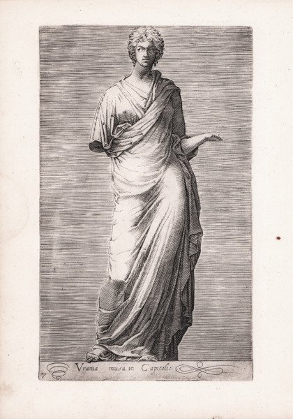 La statua è vestita con una tunica (chitone) lunga fino ai piedi e un mantello (himation); quest’ultimo, avvolto attorno al corpo, passa sopra la spalla sinistra e sotto il braccio destro. La testa, dai tratti classicheggianti e di tipo ideale, presenta una capigliatura a ciocche raccolte dietro la nuca. Già esposta nel Casino del Belvedere in Vaticano, la statua venne restaurata forse poco dopo la sua scoperta come Urania, la musa dell’Astronomia, attraverso l’aggiunta degli attributi: un flauto nella mano destra e un altro oggetto ora scomparso, probabilmente un globo, nella sinistra. Oggi è conservata presso i Musei Capitolini (inv. 806). Opera tratta dall’Antiquarum statuarum urbis Romae…Io. Baptista de Cavalleris authore, la prima raccolta sistematica di illustrazioni di sculture antiche conservate nelle collezioni romane, che si deve all’opera dell’incisore e disegnatore Giovanni Battista Cavalieri (1525 circa - 1601) nella seconda metà del XVI secolo. Il repertorio, punto di riferimento per gli studi antiquari, conobbe grande diffusione e contribuì ad orientare l'interesse degli studiosi dell'epoca verso la statuaria antica. Il numero delle tavole, circa 50 nelle prime edizioni (databili circa al 1561/62) venne ampliato successivamente; prima del 1584 furono pubblicati i libri I e II con 100 incisioni numerate di sculture, organizzate per collezioni di appartenenza. Nel 1594 videro la luce il III e IV volume dell’opera, in cui comparvero altre 100 nuove tavole, stavolta ordinate in base all’iconografia dei soggetti. Le sculture sono raffigurate su sfondi neutri, privi di riferimenti architettonici. L’opera, con il titolo ' Antiquarum statuarum Urbis Romae primus, ' senza data, venne dedicata prima a Ottone Truchsess von Walburg – prima in qualità di diacono di S. Maria in Trastevere (1561/62) e poi di cardinale di Albano (1562/70). In seguito, con il titolo ' Antiquarum statuarum Urbis Romae primus et secundus liber ' il frontespizio reca la dedica al cardinale Ludovico Madruzzo, ed è databile al 1584/85. Nel 1594, con il titolo ' Antiquarum Statuarum Urbis Romae tertius et quartus liber, escono cento nuove tavole con dedica al cardinale G. Paluzzi degli Albertoni, del giugno 1593. Si tenga presente che, mentre nei primi due libri le statue erano pubblicate secondo le collezioni, nel terzo e quarto sono raggruppate per soggetto. La raccolta contiene, oltre alle incisioni di Giovanni Battista Cavalieri alcune tavole firmate da Cherubino Alberti, Orazio de Santis e altri famosi incisori dell’epoca. Giovanni Battista de Cavalieri o Cavalleris fu incisore, stampatore e editore. Originario di Villa Lagarina, nei pressi di Trento, risulta attivo a Venezia (dal 1559) e a Roma, dove nel 1577 apri una bottega nel quartiere Parione. Risiedeva nel vicolo di Palazzo Savelli, con uno studio vicino all’abitazione. Divenne cognato del celebre editore Lorenzo Vaccari. Realizzo lastre per Antonio Salamanca, Antonio Lafreri e Bartolomeo Faleti. Iniziò a pubblicare le sue opere intorno al 1560, ma sempre in partnership con altri: nel 1567 con Perino Zecchini e nel 1576 con Lorenzo Vaccari. Nel 1577 assunse uno stampatore, Francesco Cornuti, pubblicando opere di suoi contemporanei, tra cui Francesco Salviati, Daniele da Volterra, Raffaello, Michelangelo, Polidoro da Caravaggio, Livio Agresti e Baccio Bandinelli. ' Bulino, stampato su carta vergata coeva, in ottimo stato di conservazione. Bibliografia Thomas Ashby, ' Antiquae Statuae urbis Romae, in ' Papers of the British School at Rome, IX (1920), pp. 109-158; S. Weber, ' Artisti trentini ed artisti che operarono nel Trentino, Trento 1933, pp. 72 ss. The statue is dressed in a foot-length tunic (chiton) and a cloak (himation); the latter, wrapped around the body, passes over the left shoulder and under the right arm. The head, with classical features and an ideal type, has hair in locks gathered behind the nape of the neck. Already on display in the Casino del Belvedere in the Vatican, the statue was restored perhaps shortly after its discovery as Urania, the muse of Astronomy, through the addition of attributes: a flute in her right hand and another now-disappeared object, probably a globe, in her left. Today it is preserved in the Capitoline Museums (inv. 806). Plate taken from the ' Antiquarum statuarum urbis Romae.Io. Baptista de Cavalleris authore, ' the first systematic collection of illustrations of ancient sculptures preserved in Roman collections, which is due to the work of the engraver and draftsman Giovanni Battista Cavalieri (1525 circa - 1601) in the second half of the 16th century. The repertory, a point of reference for antiquarian studies, was widely circulated and contributed to direct the interest of scholars of the time towards ancient statuary. The number of plates, about 50 in the first editions (datable to about 1561/62) was subsequently enlarged; before 1584 books I and II were published with 100 numbered engravings of sculptures, organized according to the collections they belonged to. In 1594 come to the light of the III and IV volume of the work, in which appeared other 100 new tables, this time ordered according to the iconography of the subjects. The sculptures are depicted on neutral backgrounds, without architectural references. The work, with the title ' Antiquarum statuarum Urbis Romae primus, ' undated, was first dedicated to Ottone Truchsess von Walburg - first as deacon of S. Maria in Trastevere (1561/62) and then as cardinal of Albano (1562/70). Later, with the title ' Antiquarum statuarum Urbis Romae primus et secundus liber, ' the frontispiece is dedicated to Cardinal Ludovico Madruzzo, and can be dated 1584/85. In 1594, with the title ' Antiquarum Statuarum Urbis Romae tertius et quartus liber, ' one hundred new plates were published with a dedication to Cardinal G. Paluzzi degli Albertoni, dated June 1593. Please note that, while in the first two books the statues were publis