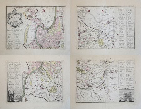 Pianta geometrica con elevazione, pubblicata a Norimberga dalla tipografia degli eredi di Johannes Baptiste Homann nel 1755. Si tratta di una rielaborazione, senza alcun aggiornamento, dell'importante rilievo di Leonardo Bufalini (1551), riportato in voga da Giovan Battista Nolli nel 1748. La legenda di 307 rimandi in latino è ripesa proprio dalla riduzione di Nolli, e ne dimostra la diretta derivazione. Tuttavia la pianta degli eredi Homann, stampata su quattro fogli e quindi di dimensioni maggiori, risulta decisamente più leggibile. ' "La pianta di Roma di Leonardo Bufalini è la prima rappresentazione coerente della città e la più importante raffigurazione ortogonale fino alla pianta grande di Giambattista Nolli (1748). Bufalini si occupò di tutte le fasi della sua realizzazione, dal rilievo all’incisione, impiegando un lungo tempo: sette anni, secondo Onofrio Panvinio, venti secondo l’editore Antonio Trevisi. La Pianta di Roma fu stampata presso il tipografo Antonio Blado il 26 maggio 1551 a Roma, con privilegio decennale della Repubblica di Venezia e la dedica a Carlo V e a papa Giulio III. Si tratta di un’opera monumentale: una xilografia in dodici fogli e quattro strisce laterali. Nessun esemplare della prima edizione è noto; se ne conoscono solo tre della seconda edizione, pubblicata sempre a Roma, dall’editore Antonio Trevisi da Lecce, due conservati alla Biblioteca Vaticana (di cui uno incompleto) e un terzo alla British Library di Londra. Sebbene la pianta sia basata su rilievi effettuati dall’autore con grande perizia, non mancano elementi di fantasia: molti monumenti antichi sono stati aggiunti, completati e ricostruiti liberamente. Del resto, è lo stesso autore a sottolineare questa ambivalenza, dichiarando di voler presentare “la città che oggi è abitata…aggiungendo la [città] antica, un tempo sovrana del mondo…” Bufalini incluse nella pianta anche un autoritratto in cui è raffigurato con in mano il compasso a due punte, mentre a sinistra sono rappresentati i suoi strumenti di lavoro, fra cui la squadra e la bussola nautica. Per una più completa trattazione degli strumenti di misurazione utilizzati e per l’accuratezza della pianta bufaliniana si rimanda ai numerosi studi pubblicati. La fonte primaria utilizzata da Bufalini è la Roma antica di Bartolomeo Marliano, inserita nella sua Urbis Romae Topographia, che ha lo stesso orientamento e la stessa precisione nei particolari. Fin dalla sua pubblicazione nel 1551, la pianta del Bufalini esercitò una notevole influenza sulle successive piante della città fino al 1748, anno in cui Giambattista Nolli ne pubblicò una copia ridotta insieme alla sua pianta grande, che si impose quale nuovo modello" (cfr. B/R p. 2372). Johann Baptist Homann è stato un geografo e cartografo tedesco; nel 1702 fondò la sua casa editrice. Homann acquisì fama come uno dei principali cartografi tedeschi, e nel 1715 fu nominato geografo imperiale dall'imperatore Carlo VI. Nello stesso anno fu anche nominato membro dell'Accademia Prussiana delle Scienze a Berlino. Nel 1716 Homann pubblicò il suo capolavoro Grosser Atlas ueber die ganze Welt. Numerose mappe furono redatte in collaborazione con l'incisore Christoph Weigel. Homann morì a Norimberga nel 1724. Gli successe suo figlio Johann Christoph (1703-1730). L'azienda continuò dopo la sua morte come azienda degli eredi Homann, gestita da Johann Michael Franz e Johann Georg Ebersberger. Dopo successivi cambiamenti nella gestione, l'azienda si sciolse nel 1852. ' Acquaforte, 4 lastre di dimensioni 495x365 mm ciascuna, stampate su altrettanti fogli di carta vergata coeva, con margini e ancora da unire, in perfetto stato di conservazione. Bibliografia Huelsen (1915), n. 3; Scaccia Scarafoni (1939), n. 136; Marigliani (2007): n. 32. Per la pianta del Bufalini: Bifolco/Ronca (2018), Cartografia e topografia italiana del XVI secolo, pp. 2372-73, tav. 1221. Geometric plan with elevation, published in Nuremberg by the printing hose of Johannes Baptiste Homann's heirs in 1755. It is a reworking, without any updating, of the important relief by Leonardo Bufalini (1551), brought back by Giovan Battista Nolli in 1748. The key-legend of 307 references in Latin is taken from Nolli's reduction, and demonstrates its direct derivation. However, the map of the Homann heirs, printed on four sheets and therefore larger in size, is much more clear. Leonardo Bufalini's map of Rome is the first coherent representation of the city and the most important orthogonal representation up to the large plan by Giambattista Nolli (1748). Bufalini took care of all the phases of its realization, from relief to engraving, using a long time: seven years, according to Onofrio Panvinio, twenty according to the publisher Antonio Trevisi. The Map of Rome was printed at the typographer Antonio Blado on May 26, 1551 in Rome, with the ten-year privilege of the Republic of Venice and dedicates it to Charles V and Pope Julius III. It is a monumental work: a woodcut in twelve sheets and four lateral strips. ' Although the map is based on reliefs made by the author, there is no lack of elements of fantasy: many ancient monuments have been added, completed and rebuilt freely. ' The primary source used by Bufalini is Bartolomeo Marliano's ancient Rome, inserted in his Urbis Romae Topographia, which has the same orientation and the same precision in detail. Since its publication in 1551, Bufalini's map exerted a notable influence on the subsequent plans of the city until 1748, the year in which Giambattista Nolli published a reduced copy together with his large plan, which became the new model. Johann Baptist Homann was a German geographer and cartographer; in 1702 he founded his own publishing house. Homann acquired renown as a leading German cartographer, and in 1715 was appointed Imperial Geographer by Emperor Charles VI. In the same year he was also named a member of the Prussian Academy of Sciences in Berlin. I