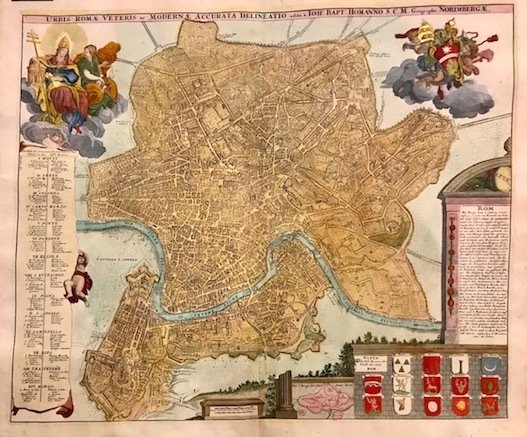 Incisione originale su rame (cm. 58x49 più ampi margini bianchi) tratta dal monumentale ‘Atlas Novus Terrarum Orbis Imperia, Regna et Status’. Bella coloritura antica all’acquarello con ritocchi in oro. In alto a destra lo stemma di papa Clemente XI, più in basso entro cornice architettonica descrizione di Roma, nell’angolo inferiore a destra gli stemmi dei rioni ed infine, in alto a sinistra, le figure allegoriche della Chiesa e della Giustizia. Esemplare in ottimo stato di conservazione. Marigliani (n. 133): ‘Sebbene stampata intorno al 1720 raffigura la città alla fine del Seicento, come avviene per un cospicuo nucleo di piante derivate dal Falda.’; Scaccia Scarafoni, n. 210.