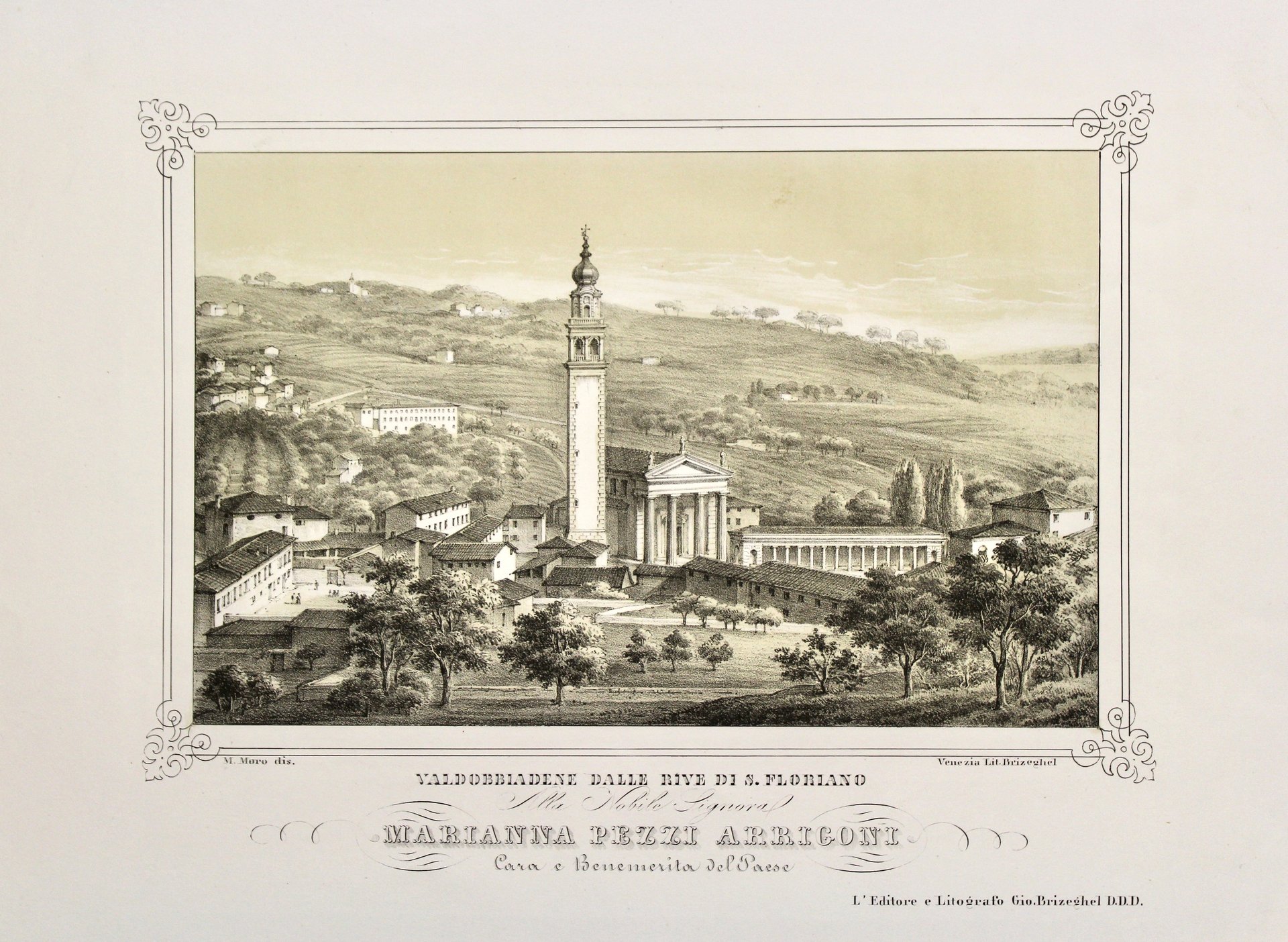 Litografia, mm 180x290 (immagine), eseguita su disegno di Moro dall'editore litografo Brizeghel. Tratta dall'opera "Treviso e la sua provincia" composta da 24 tavole rappresentanti gli scorci più caratteristici e rappresentativi della città e dintorni. Bellissimo esemplare molto marginoso.<BR>Litograph, mm 174x280 (immagine), on subject by Moro printed by Brizeghel. From "Treviso e la sua provincia" 24 plates illustrating the most significant views of Treviso and surroundings. Very good condition.