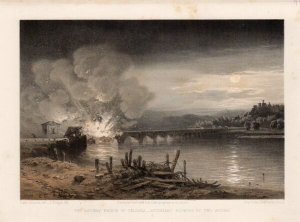 VALENZA - Guerra d'Italia. - "The railway bridge of Valenza - austrians blowing up two arches". Litografia a colori, veduta suggestiva notturna con lo scoppio sul ponte bene in evidenza. Molto decorativa.
