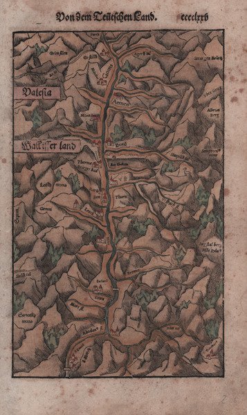 Tavola tratta dalla ' Cosmographiae Universalis, edizione in tedesco, Basilea, seconda metà del XVI secolo.La ' Cosmographiae Universalis ' di Sebastian Münster (1488-1552), stampata per la prima volta Basilea nel 1544 dall’editore Heinrich Petri, venne più volte aggiornata e aumentata di nuove carte geografiche e rappresentazioni urbane nelle sue numerose edizioni che arrivano all’inizio del secolo successivo. Münster aveva lavorato a raccogliere informazioni al fine di ottenere un'opera che non deludesse le aspettative e, dopo un'ulteriore pubblicazione in tedesco abbellita da 910 stampe su legno, giunse nel 1550 all'edizione definitiva in latino, illustrata da 970 silografie. Vi furono poi numerose edizioni in diverse lingue, fra cui latino, francese, italiano, inglese e ceco. Dopo la sua morte di Münster (1552), Heinrich Petri prima, e il figlio Sebastian poi, continuarono la pubblicazione dell’opera. La ' Cosmographia universalis ' fu uno dei libri più popolari e di successo del XVI secolo, e vide ben 24 edizioni in 100 anni: l'ultima edizione tedesca venne pubblicata nel 1628, molto tempo dopo la morte dell'autore. La ' Cosmographia ' conteneva non solo le ultime mappe e vedute di tutte le città più famose, ma anche una serie di notizie enciclopediche di dettagli relative al mondo conosciuto, e sconosciuto. Il particolare successo anche commerciale di quest'opera fu dovuto in parte alle belle incisioni (tra i cui autori si possono citate Hans Holbein il Giovane, Urs Graf, Hans Rudolph Manuel Deutsch, David Kandel). Silografia, bella coloritura a mano, in buone condizioni. Plate taken from the ' Cosmographiae Universalis, German edition, Basel, second half of the 16th Century. The ' Cosmographiae Universalis ' of Sebastian Münster (1488-1552), printed for the first time in Basel in 1544 by the publisher Heinrich Petri, was updated several times and increased with new maps and urban representations in its many editions until the beginning of the next century. Münster had worked to collect information in order to obtain a work that did not disappoint expectations and, after a further publication in German embellished with 910 woodblock prints, arrived in 1550 to the final edition in Latin, illustrated by 970 woodcuts. There were then numerous editions in different languages, including Latin, French, Italian, English and Czech. After his death in Münster (1552), Heinrich Petri first, and then his son Sebastian, continued the publication of the work. The ' Cosmographia universalis ' was one of the most popular and successful books of the 16th century, and saw as many as 24 editions in 100 years: the last German edition was published in 1628, long after the author's death. The ' Cosmographia ' contained not only the latest maps and views of all the most famous cities, but also a series of encyclopedic details related to the known, and unknown, world. The particular commercial success of this work was due in part to the beautiful engravings (among whose authors can be mentioned Hans Holbein the Younger, Urs Graf, Hans Rudolph Manuel Deutsch, David Kandel). Woodcut, beautiful hand-coloring, in good condition. Cfr.