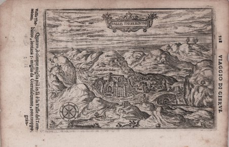 Opera tratta dalla seconda edizione del "Il Devotissimo Viaggio Di Gerusalemme. Fatto, & descritto in sei libri dal Sigr. Giovanni Zuallardo, Cavaliero del Santiss Sepolcro di N.S. l'anno 1586. Aggiontovi i disegni di varii di varii luoghi di Terra Santa & altri paesi intagliati da Natale Bonifacio Dalmata" di Giovanni Zuallardo [Jean Zuallart] stampato a Roma per la prima volta da F. Zanetti & Gia Ruffinelli nel 1587. La carta è firmata da Natale Bonifacio. Zuallart viaggiò nella Terra Santa nel 1586, e al suo ritorno a Roma venne stampato questo resoconto del viaggio, illustrato da Natale Bonifacio. Jean Zuallart, fiammingo di nascita, si trasferì a Roma. La sua opera conosce diverse ristampe.Incisione in rame, in buone conditioni . Rara. A rare map taken from the secon editions of "IL DEVOTISSIMO VIAGGIO DI GERUSALEMME. Fatto, & descritto in sei libri dal Sigr. Giovanni Zuallardo . l'anno 1586. Aggiontovi i disegni di varii luoghi di Terra Santa & altri paesi intagliati da Natale Bonifacio Dalmata". The map is engraved in the unique style of Natale Bonifacio. Zuallart traveled to and around Palestine [in 1586]. The following year (1587), his Il Devotissimo Viaggio Di Gerusalemme was printed in Rome." (The Road to Jerusalem, Noonan, pg 167). "Jean Zuallart (Giovanni Zuallardo) was a Fleming by birth; and made his journey to Jerusalem after having resided in Rome. His book was first printed several times in Italian at Rome." (Biblical Researches in Palestine, Robinson, pg 543). Copperplate, some waterstains, generally in good conditions. Cfr.