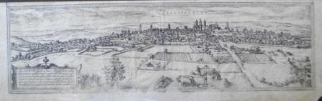 Dal "Civitatus Orbis terrarum", 1612 circa. Incisione in rame all'acquaforte, b/n, cm 16 x 51,5 (il foglio) L'opera rappresenta uno dei libri più importanti sui piani urbanistici divulgati nel corso del XVII secolo. La stampa (come spesso accade nelle vedute del Braun – Hogenberg) prevede nella parte superiore un'altra veduta, la veduta di Toledo. Le troviamo in commercio spesso separate proprio perché trattasi di vedute distinte, con titoli separati. Impressione stanca nella parte inferiore e rifilato il margine superiore in prossimità della lastra, discreta conservazione.