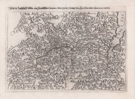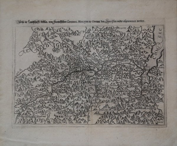 Carta geografica della Valtellina tratta dal "Ostreichischer Loberkrantz" di Schinborner e Lundorp pubblicato a Francoforte nel 1627-8. La mappa è comunemente detta "del Marchese di Couvre" che era il Generale al comando delle truppe francesi. Incisione in rame, in ottimo stato di conservazione. Bibliografia: Scheffer , Cartografia antica della Rezia, 27 ; Bianchi, Valtellina, Valchiavenna e Grigioni sotto la lente. Antica cartografia dal XVI al XVIII secolo, 61. Map of Valtellina form the "Ostreichischer Loberkrantz" by Schinborner and Lundorp published in Frankfurt in 1627-8. Cfr.