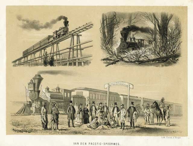 Tre vignette in unico foglio, raffiguranti diversi momenti del percorso ferroviario: ponte in legno, sosta nella prateria, caduta di un albero sulla linea ferroviaria. In color seppia