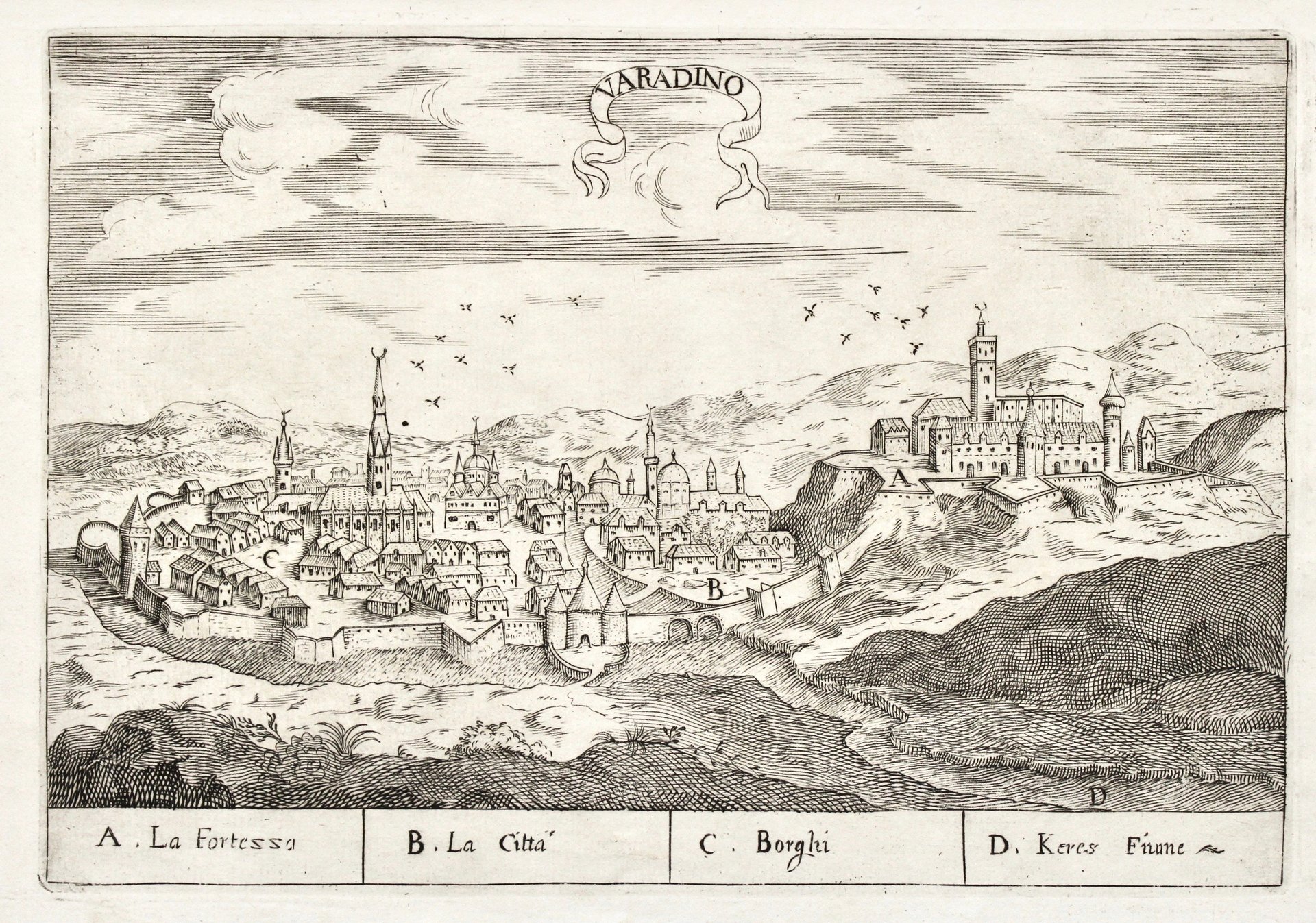 Incisione in rame, mm 140x200. Bella veduta prospettica della città di Oradea in Romania. Tratta da “Diario della campagna fatta in Ungheria”. Buon esemplare.
