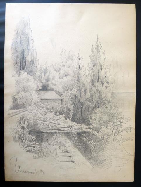 Due disegni fronte retro a matita grigia su carta, cm 25,5 x 35 circa. Al fronte il disegno titolato “Varenna” e datato 3.9.89 (3 settembre 1889); al retro il disegno titolato “Alsbach” e datato 2.4.94 (2 aprile 1894). Nel disegno di Varenna è raffigurato un primo piano boscoso con un tetto che emerge, nel disegno di Alsbach, località tedesca dell’Assia, una tipica abitazione in legno. Buono stato. .