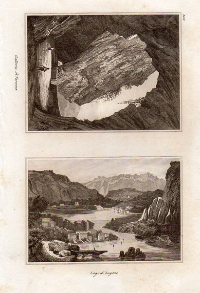 VARENNA e LUGANO - Due vedute in acciaio in un'unica tavola: 1) Galleria di Varenna. F. 8,7 x 11,5. - 2) Lago di Lugano. F. 11,5 x 7,8.