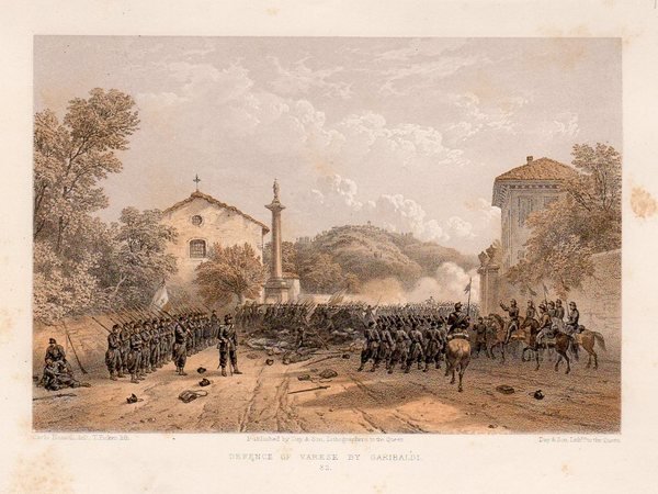 VARESE -“ Guerra 'Italia. “Defence of Varese by Garibaldi. Carlo Bossoli del.t. Bella litografia a colori con truppe schierate e feriti all'ingresso della città .
