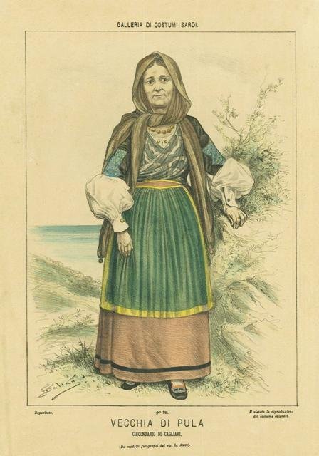 Costume del luogo in coloritura coeva. Inserita nell'opera "Galleria di Costumi Sardi" pubblicata nel settimanale satirico, umoristico, letterario Il Buonumore. Questa serie Dalsani riguarda 40 litografie colorate a mano all'epoca da Giorgio Ansaldi disegnatore piemontese (Mondovì, 1844 - 1922) che usava come pseudonimo l’anagramma del suo cognome firmando le sue opere G.Dalsani.