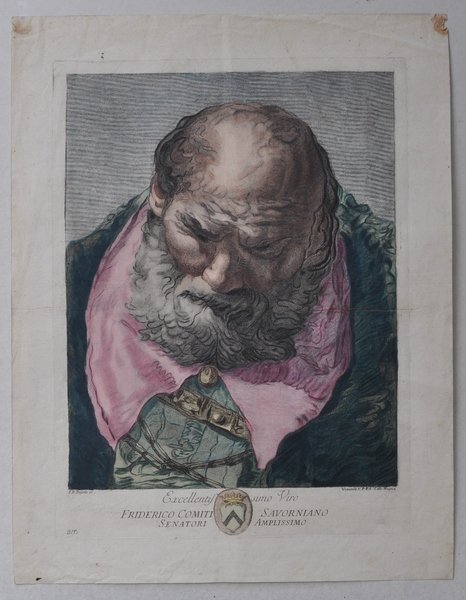Vernice molle a sanguigna, (43 x 32) cm. Acquarellatura probabilmente d'epoca. In basso a sinistra "I. B. Tiepolo", a destra "Venezia C.P.E.S. Calc. Magna". Più in basso "Excellentissimo Viro Friderico comiti Savorniano Senatori Amplissimo" e stemma Savorgnan al centro, sul margine inferiore. Più in basso a sinistra B. n.°3. La stampa fa parte di una serie di dodici tavole "Dodici caprocciose figure" che recano sul margine inferiore una dedica a importanti personaggi dell'epoca. Questa stampa deriva da un disegno di Giambattista Tiepolo e reca una dedica a Giambattista Savorgnan. (L'Eredità di Piazzetta, Il Cardo 1996). Petrucci, 1938, p. 549; Pallucchini, 1941, p.47,nn. 128, 129; Dillon, 1976, p. 16.
