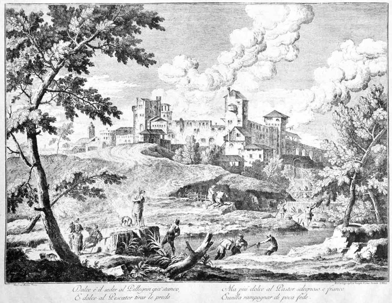 Cm. 54x42 al vivo, riproduzione di stampa d'epoca, stampata a torchio in bianco e nero, riproducente veduta di campagna.In buono stato.