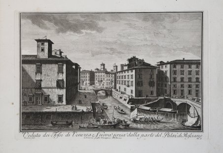 Veduta tratta dalla Raccolta delle più belle vedute della città e porto di Livorno, Giuseppe Maria Terreni, Livorno, stampata a Livorno da Giuseppe M. Terreni, nel 1783. Si tratta di una rara opera di formato in-folio oblungo, composta da frontespizio inciso, dedica a Pietro Leopoldo, pianta della città e 17 tavole numerate, incise in rame da Berardi, Daniotto, Fambrini, Galli e Nerici. Esemplare nel primo stato di due, stampato da Terreni. Le tavole furono successivamente ristampate con imprint “In Livorno Presso Giacomo Aliprandi”. ' Magnifica prova, ricca di toni, impressa su carta vergata coeva, in perfetto stato di conservazione. Esemplare in barbe. View taken from the Raccolta delle più belle vedute della città e porto di Livorno, Giuseppe Maria Terreni, Livorno, printed in Livorno, Giuseppe M. Terreni, in 1783. This is a rare work of oblong format in-folio, consisting of engraved title page, dedication to Peter Leopold, plan of the city and 17 numbered tables, engraved in copper by Berardi, Daniotto, Fambrini, Galli and Nerici. Plate in the first state of two, printed by Terreni. The plates were later reprinted with imprint “In Livorno Presso Giacomo Aliprandi”. ' Magnificent proof, printed on contemporary laid paper, in perfect condition. Untrimmed copy. Cfr. Cfr. Piero Frati, Livorno nelle antiche stampe, pp. 25-26, nn. 125-142 e pp. 96-97