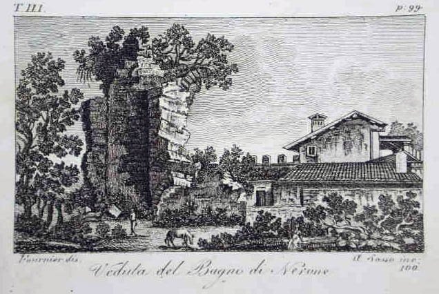 Stampa antica ed originale con veduta dei resti archeologici. Autore: Sasso A. Luogo: Toscana. Anno: 1827. Tecnica: incisione in rame. Dimensioni: 55x95 mm