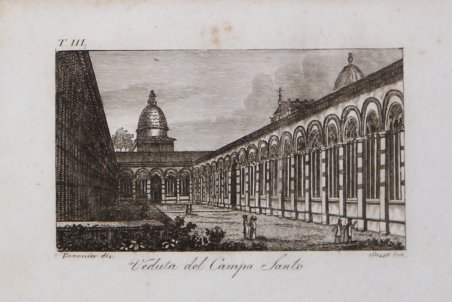 Veduta tratta dal celebre "Il viaggio pittorico della Toscana", stampato a Firenze, per Giovanni Marenigh, 1817.Celebre opera che costituisce uno straordinario affresco iconografico dell'intera Toscana. L'abate Francesco Fontani (Firenze, 1748-1818), dotto erudito, dopo gli studi compiuti nel seminario del Collegio Eugeniano si trasferì a Roma ove insegnò eloquenza nel Collegio Bandinelli. Si dedicò agli studi artistici e archeologici e, rientrato a Firenze, divenne Bibliotecario alla Riccardiana, occupandosi anche della Accademia della Crusca. Fu parroco nella chiesa di Santa Lucia dei Magnoli. "Il viaggio pittorico della Toscana" costuisce la sua opera più rinomata.Riproducendo fedelmente le tavole incise dai fratelli Terreni durante il loro viaggio del 1801,fu pubblicata la prima volta tra il 1801 e il 1803 per i tipi del Tofani a Firenze e in seguito, in questa versione ridotta nel formato, da Giovanni Marenigh nel 1817-1818 e nel 1822. Veduta tratta dal celebre "Il viaggio pittorico della Toscana", stampato a Firenze, per Giovanni Marenigh, 1817.Celebre opera che costituisce uno straordinario affresco iconografico dell'intera Toscana. L'abate Francesco Fontani (Firenze, 1748-1818), dotto erudito, dopo gli studi compiuti nel seminario del Collegio Eugeniano si trasferì a Roma ove insegnò eloquenza nel Collegio Bandinelli. Si dedicò agli studi artistici e archeologici e, rientrato a Firenze, divenne Bibliotecario alla Riccardiana, occupandosi anche della Accademia della Crusca. Fu parroco nella chiesa di Santa Lucia dei Magnoli. "Il viaggio pittorico della Toscana" costuisce la sua opera più rinomata.Riproducendo fedelmente le tavole incise dai fratelli Terreni durante il loro viaggio del 1801,fu pubblicata la prima volta tra il 1801 e il 1803 per i tipi del Tofani a Firenze e in seguito, in questa versione ridotta nel formato, da Giovanni Marenigh nel 1817-1818 e nel 1822. Cfr. Fossati Bellani, II, 3377; Lozzi, 5462, Bigazzi, 1341 e 1342, cita le edizioni 1801-1803 e 1817.