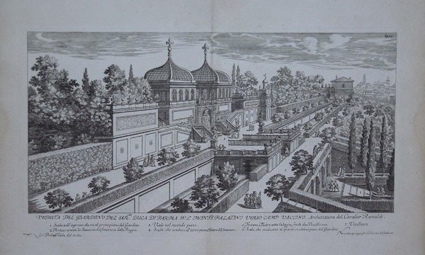Bella veduta particolare degli Orti Farnesiani sul Palatino. La veduta mostra bene la disposizione a quattro terrazze del grande giardino Tavola tratta dal Li giardini di Roma, disegnati da Giovanni Battista Falda…nuovamente dati alle stampe con direttione di Giov. Giacomo de Sandrart, edita a Norimberga da J. Von Sandrart intorno al 1685 circa. Questo lavoro di Sandrart deriva dalla famosa opera di Giovan Battista Falda Li Giardini di Roma con le loro piante alzate e vedute in prospettiva disegnate ed intagliate da Gio. Battista Falda, curato da Gian Giacomo de Rossi qualche anno prima (la prima edizione fu pubblicata sicuramente dopo il 1677 ma prima del 1683) che comprendeva 19 tavole di piante e vedute prospettiche dei più celebri giardini romani di cui 14 incise da G.B. Falda e 5 da Simon Felice. Le tavole di questa edizione tedesca, numerate in cifre romane, vennero tutte incise sulla base di quelle originarie, con poche varianti, ben evidenti dal confronto tra le due opere. Sorprende, pertanto, che spesso quest’opera di Sandrart circoli erroneamente sotto il nome di Falda quale autore; sbaglia anche Paolo Bellini in TIB affermando che Sandrart utilizzò due rami originali di Falda. Per le sue incisioni, il Sandrart si avvalse dei suoi collaboratori Karl Gustav von Amling (1650-1703); Philip Kilian (1628-1693); Richard Collin (1627-97); Georg Andreas Wolfgang (1631-1716); Johann Georg Waldreich (d.1680); Melchior Küsel (1626-1683); Franck, Johann (fl.1659-1690); George Christoph Eimmart (1638-1705); Susanna Maria von Sandrart (1658-1716); Bartholomäus Kilian (1630-1696). Joachim von Sandrart fu un pittore di una certa importanza, ma è per la sua Teutsche Academie che è principalmente ricordato. Il suo compendioso trattato include sezioni sulla scultura antica e l'architettura, la prospettiva, la teoria della pittura, biografie di artisti, una traduzione delle Metamorfosi di Ovidio e così via. La seconda parte del Libro I pretende di dare una storia dell'arte dalle sue prime origini, e si apre con un'incisione di due scene di racconti leggendari della scoperta del disegno. Acquaforte, con margini, ottimo stato di conservazione. Bibliografia National Gallery (Washington), ' Mark J. Millard, III (1998), no. 111; F.W. H. Hollstein, ' German engravings . ca. 1400-1700 ' (1954-), 38-41; Anna Schreurs, ' Unter Minerva schutz: bildung durch kunst in Joachim von Sandrarts 'Teutscher Academie' ' (2012). Nice view of the Farnesian Garden on the Palatino Hill. Plate taken from Li giardini di Roma, disegnati da Giovanni Battista Falda.nuovamente dati alle stampe con direttione di Giov. Giacomo de Sandrart, published in Nuremberg by J. Von Sandrart around 1685 circa. This work by Sandrart derives from the famous Li Giardini di Roma con le loro piante alzate e vedute in prospettiva disegnate ed intagliate da Gio. Battista Falda, edited by Gian Giacomo de Rossi a few years earlier (the first edition was certainly published after 1677 but before 1683) which included 19 plates of maps and perspective views of the most famous Roman gardens, 14 of which were engraved by G.B. Falda and 5 by Simon Felice. The plates of this German edition, numbered in Roman numerals, were all engraved on the basis of the original ones, with a few variations, clearly evident in the comparison between the two works. It is surprising, therefore, that this work by Sandrart is often mistakenly circulated under the name of Falda as the author; Paolo Bellini is also wrong in TIB stating that Sandrart used two original plaets by Falda. For the plates Sandrart used his students as and many others artist as Karl Gustav von Amling (1650-1703); Philip Kilian (1628-1693); Richard Collin (1627-97); Georg Andreas Wolfgang (1631-1716); Johann Georg Waldreich (d.1680); Melchior Küsel (1626-1683); Franck, Johann (fl.1659-1690); George Christoph Eimmart (1638-1705); Susanna Maria von Sandrart (1658-1716); Bartholomäus Kilian (1630-1696). Joachim von Sandrart was a painter of some note but it is for his Teutsche Academie that he is chiefly remembered. His compendious treatise includes sections on ancient sculpture and architecture, perspective, the theory of painting, artists’ biographies, a translation of Ovid’s Metamorphoses and so on. The second part of Book I purports to give a history of art from its earliest origins, and opens with an engraving of two scenes of legendary accounts of the discovery of drawing. Etching with margins, very good condition. References National Gallery (Washington), ' Mark J. Millard, III (1998), no. 111; F.W. H. Hollstein, ' German engravings . ca. 1400-1700 ' (1954-), 38-41; Anna Schreurs, ' Unter Minerva schutz: bildung durch kunst in Joachim von Sandrarts 'Teutscher Academie' ' (2012). Cfr.