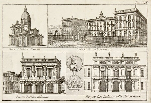 Incisione in rame con le vedute di vari palazzi di Brescia, 147x222. Tratta da: "Lo stato presente di tutti i paesi e popoli del mondo naturale, politico, e morale…". Bell'esemplare con tracce delle pieghe originali.