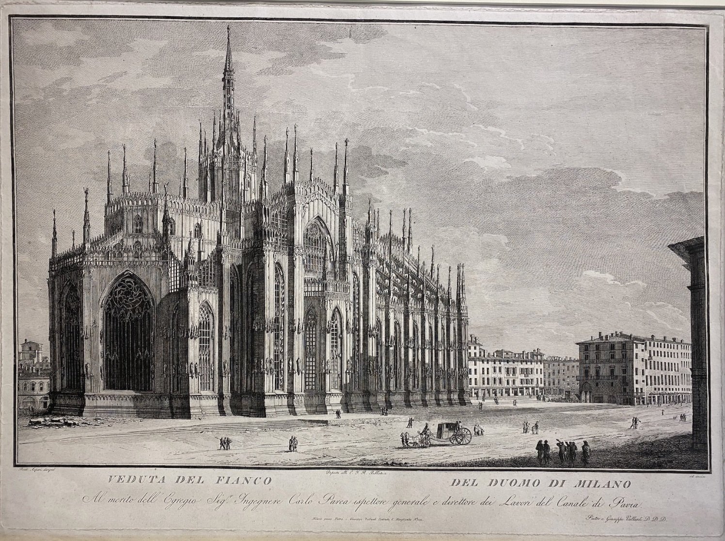 Tavola numero 13 della serie di sedici dal titolo: Vedute di Milano. Il Duomo di Milano, ancora non ultimato, è visibile dall’abside e lungo il fianco destro mettendo in risalto la maestosità delle vetrate e delle guglie. In primo piano alcuni passanti e una carrozza nel grande spazio ancora non ingombro dagli edifici moderni. Sotto il soggetto è inciso: Dom. Aspari disegnò Deposta alla C.I.R Biblioteca ed incise/ VEDUTA DEL FIANCO DEL DUOMO DI MILANO/Al merito dell'Egregio Sig. Ingegnere Carlo Parca ispettore generale e direttore del Canale di Pavia/Milano presso Pietro e Giuseppe Vallardi Contrada Santa Margherita N°1101. Pietro e Giuseppe Vallardi D. D. D. Esemplare appartenente alla II edizione Vallardi 1808, con la leggenda su due righe sostituita dalla dedica, l'aggiunta delle guglie dei coronamenti e delle arcate, titolo modificato.
