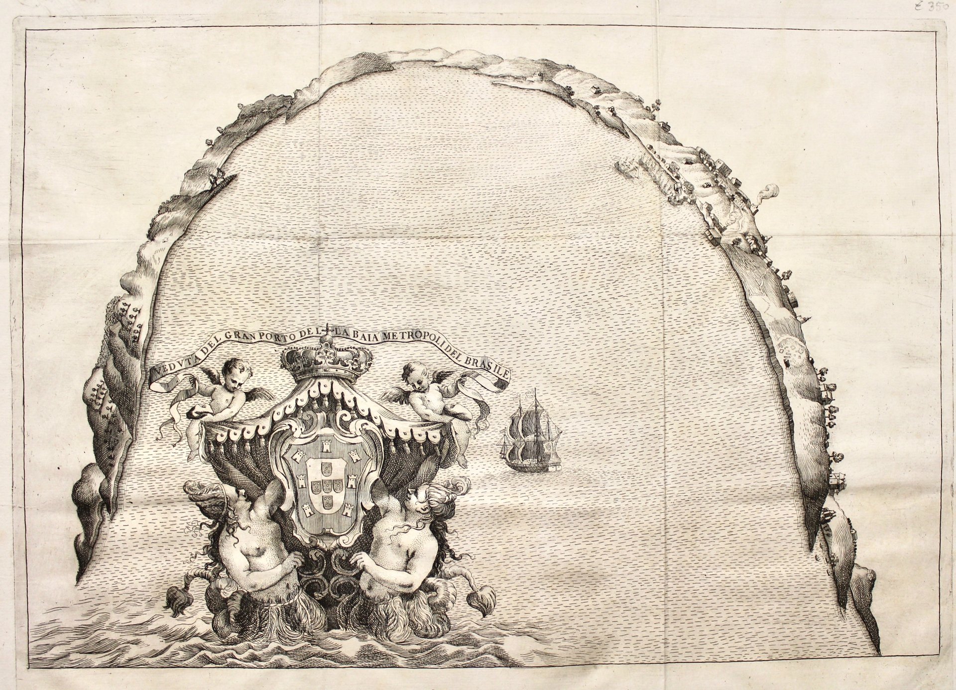 Incisione in rame di H. Vincent (1680 - 1730), su disegno di Andreas Antonius Horatij. Mm 385x510. Ottimo esemplare di questa carta della baia di Salvador de Bahia, tratta da "Istoria delle guerre del regno del Brasile" del monaco João José de Santa Teresa. Copper engraving 376x506. One of the first maps of the Salvador de Bahia's area by H. Vincent; from "Istoria delle guerre del regno del Brasile". Piccolo foro restaurato anticamente nel mare.