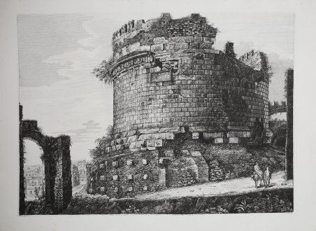 LE ANTICHITA ROMANE Tavola tratta dalla serie delle Antichità Romane, composta di 101 tavole, che viene realizzata con il ricavato della e vendita dei rami della Raccolta di cinquanta principali vedute di antichità tratte da scavi fatti in Roma in questi ultimi tempi divise in 40 vedute, edita nel 1817. Con quest’opera, per il numero delle tavole e per il formato prescelto, di grandi dimensioni, l’incisore vuole affermarsi come figura di primo piano nel mondo artistico romano. In quest’opera Rossini si cimenta in un diretto confronto con il suo predecessore G. B. Piranesi che costituisce un punto di riferimento per un incisore di vedute antiche per quanto riguarda l’originalità e l’ampiezza della riproduzione. Il Rossini, oltre a sottolineare la sua influenza nella scelta del titolo e di alcune didascalie, usa frequentemente le medesime inquadrature e identici punti di vista del maestro veneziano. Altro elemento riconducibile a Piranesi è l’uso della luce e dei forti contrasti chiaroscurali. La volontà di voler animare le vedute, restituendo il monumento al suo contesto storico e la propria inadeguatezza nel campo della figura, porta Rossini ad una collaborazione con Bartolomeo Pinelli, incisore romano, interprete e illustratore del costume e della vita popolare; a cui si devono le figure e i gruppi caratteristici che corredano le vedute. Pinelli, in alcuni casi, riprende i motivi tratti dalle sue precedenti raccolte di Costumi pittoreschi romani. ' Acquaforte, impressa su carta coeva, in buono stato di conservazione. ROMAN ANTIQUITIES A nice view taken from the Antichità Romane, set of 101 plates, realized with the proceeds of the sale of the plates used for Raccolta di cinquanta principali vedute di antichità tratte dai scavi fatti in Roma in questi ultimi tempi […], published in 1817. This is the work with which the artist wanted to become one of the most important artists in the Roman cultural life; we can state that if we consider the size of the work and the subject he choose. In this work Rossini tested himself with his predecessor, G. B. Piranesi, who was considered as a point of reference when it came to ancient views and originality. Rossini, was deeply influenced by Piranesi, as it can be seen in the title, the legends, the same points of views and framing. Another important element he took from Piranesi is the use of light and the contrast of chiaroscuro. In these plates Rossini reached the higher mastery of the technique, realizing also extremely particular framings and a new and complex organization of the space. In the plates quite common is the diagonal view of the subject, which gave him the possibility to elaborate more the chiaroscuro. The will to give life to his views, the reinstatement of the monuments to their historic context and the fact that he was not good with figures, brought Rossini to start a partnership with Bartolomeo Pinelli, Roman engraver and costume illustrator of daily life. He was the one who realized the figures of Rossini’s views. Sometimes Pinelli took the subjects from his previous collection Costumi pittoreschi romani. ' Etching, printed on contemporary paper, good condition. Cfr. Luigi Rossini incisore. Vedute di roma 1817 - 1850, catalogo della mostra a cura di L. Gavazzi, M. E. Tottoni, Roma Palazzo Braschi, 7 aprile - 15 luglio 1982. Roma
