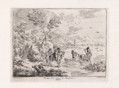 Veduta del lago con due uomini a cavallo in primo piano; tre uomini in barca a destra; elementi architettonici e montagne sullo sfondo. Tavola 79 dalla serie Raccolta di cento pensieri diversi di Anton Domenico Gabbiani (1762). Incisione di Giambattista Galli, da Antonio Domenico Gabbiani. Sotto l'immagine: ' 'A. D. Gabbiani inv. / Veduta del Lago di Bolsena / G. B. Galli scolpi' Numerata 'LXXIX. Acquaforte, stampata su carta vergata coeva, con ampi margini, in ottime condizioni. Rara. Plate 79 from the series Raccolta di cento pensieri diversi di Anton Domenico Gabbiani (Firenze, 1762). Etched by Giambattista Galli, after Antonio Domenico Gabbiani. Lettered below the image 'A. D. Gabbiani inv. / Veduta del Lago di Bolsena / G. B. Galli scolpi' Numbered 'LXXIX View of a lake, with two men on horseback in the foreground; three men in a boat at right; architectural features and mountains in the background Etching, in very good condition. Cfr.