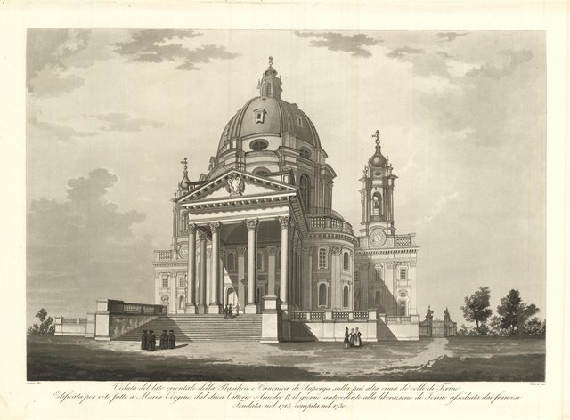 Veduta del lato orientale della Basilica e Canonica di Superga sulla più alta cima de' colli di Torino .