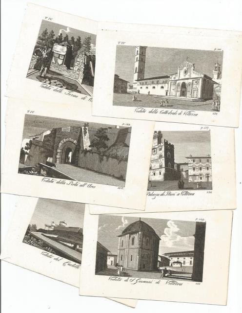 Dal "Viaggio pittorico della Toscana" dell'Abate Francesco Fontani (Firenze, Francesco Batelli, 1817 circa, tomo IV) serie di sei incisioni in rame all'acquaforte, b/n, cm 8,5 x 13 circa (il foglio). Piccole vedute della città di Volterra, ben impresse e in ampi margini. .
