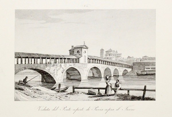 Veduta del Ponte coperto di Pavia sopra il Ticino.